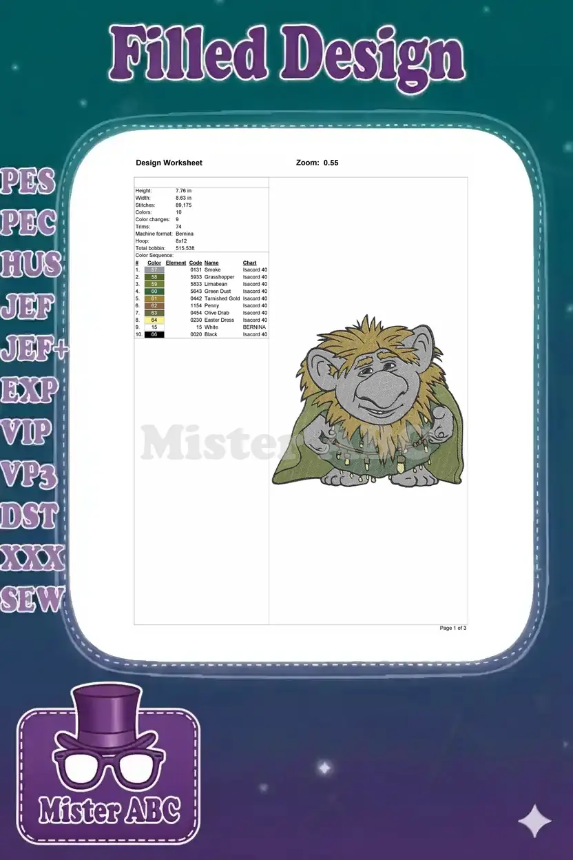 Smiling Mythical Troll Creature with Shaggy Hair Embroidery Designs – Instant Download