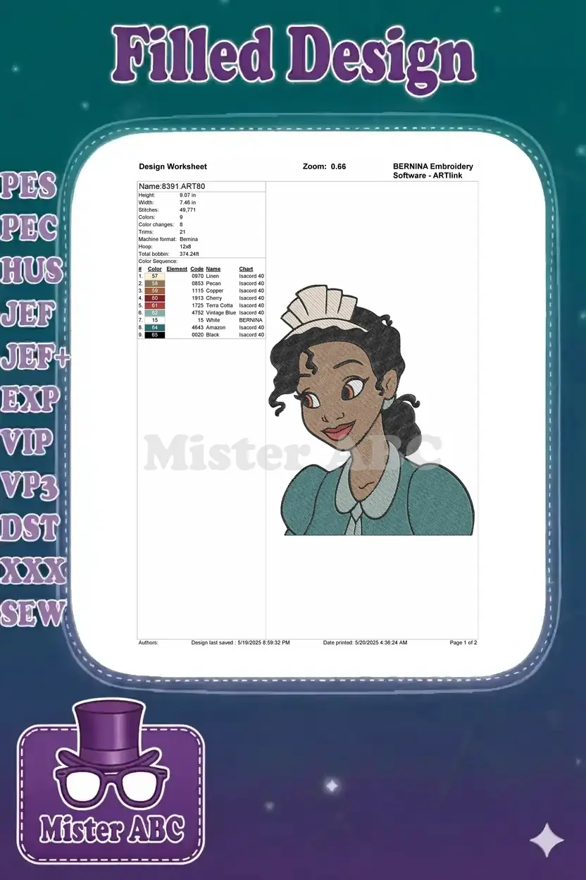 Capture the charm of Princess Tiana in her iconic maid uniform with this delightful embroidery design. Perfect for Disney fans and themed projects.
