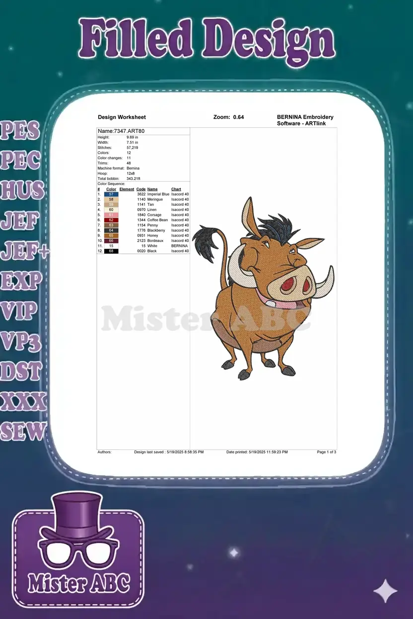 Smiling Pumbaa Warthog Disney Lion King character embroidery designs