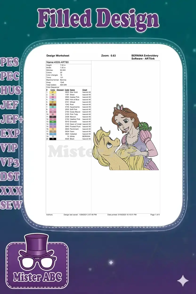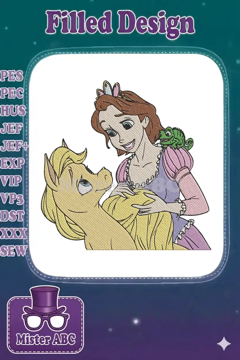 Smiling Rapunzel Princess with Maximus Horse and Pascal Chameleon Embroidery Designs
