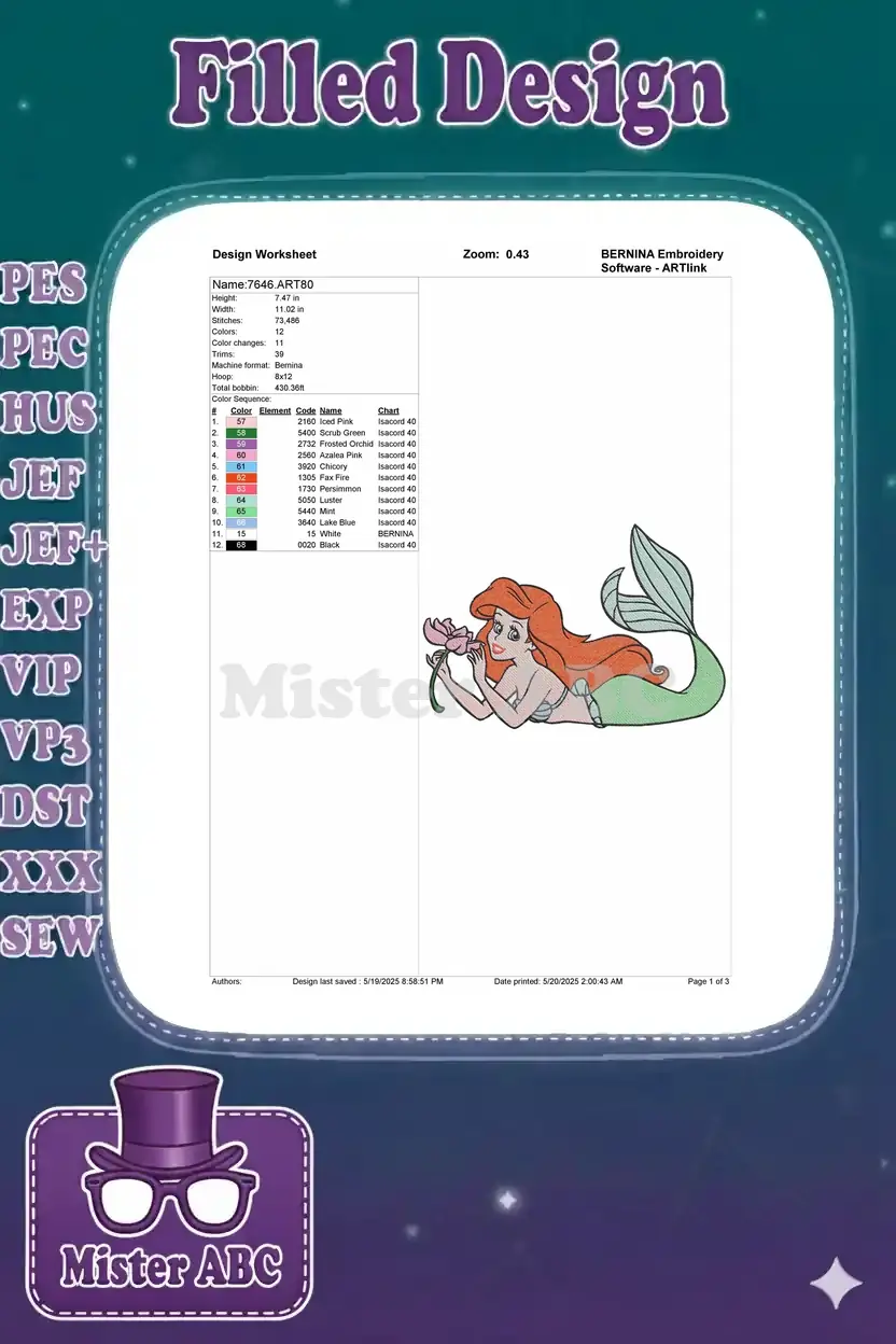 Smiling red-haired mermaid princess holding a pink flower embroidery designs