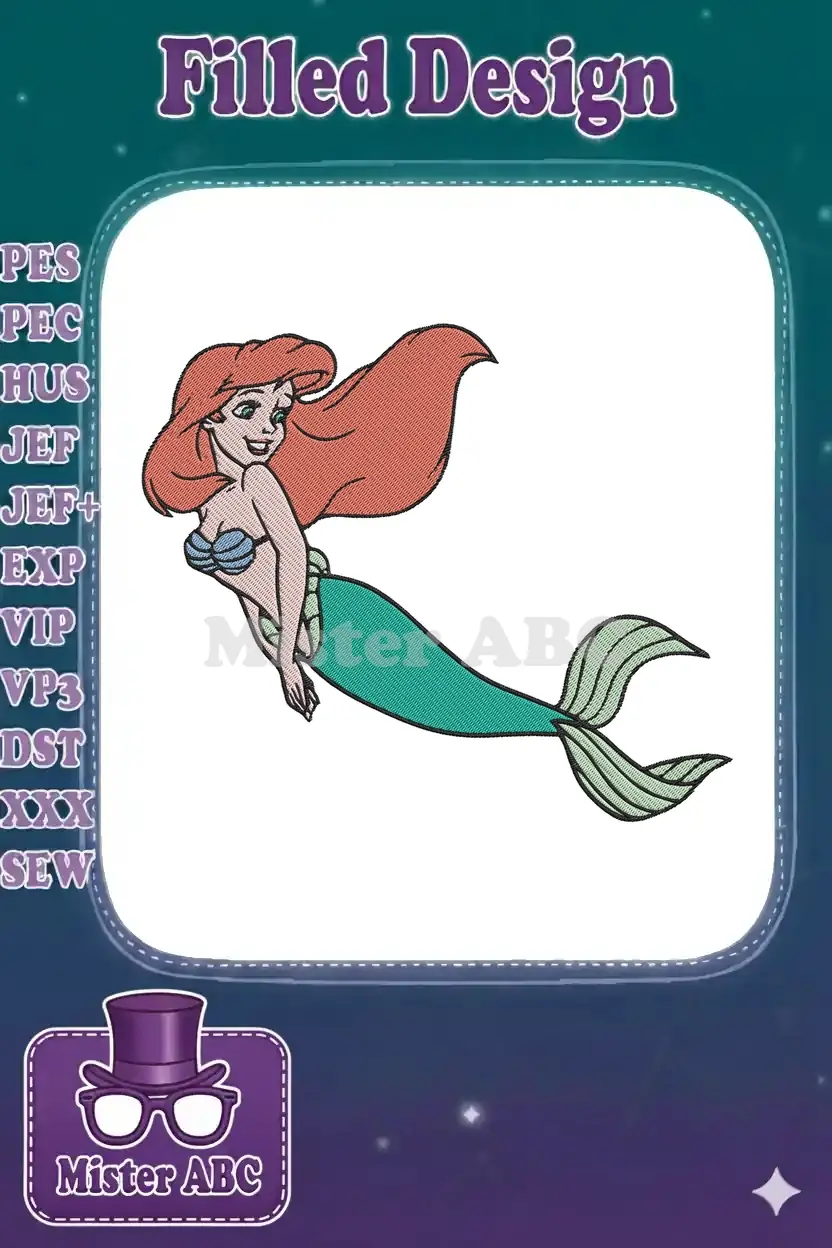 Smiling Red-Haired Mermaid Princess Cartoon Embroidery Designs for Children