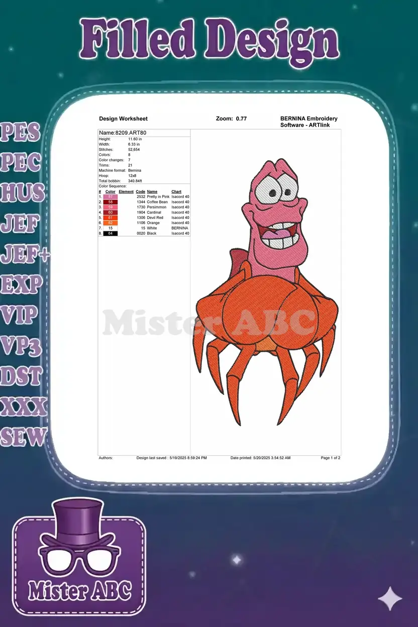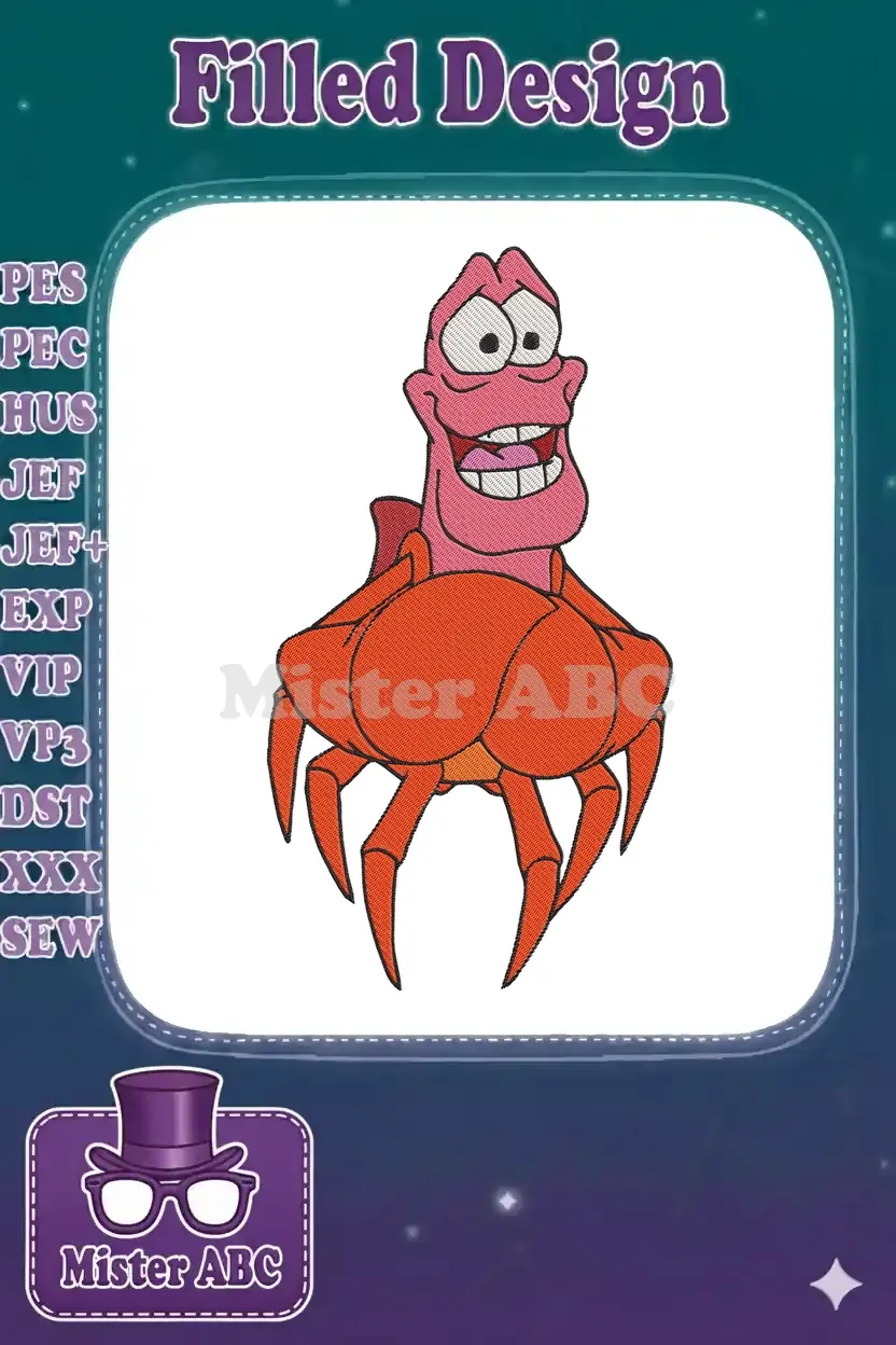 Smiling Sebastian the Red Crab Disney Character Embroidery Designs