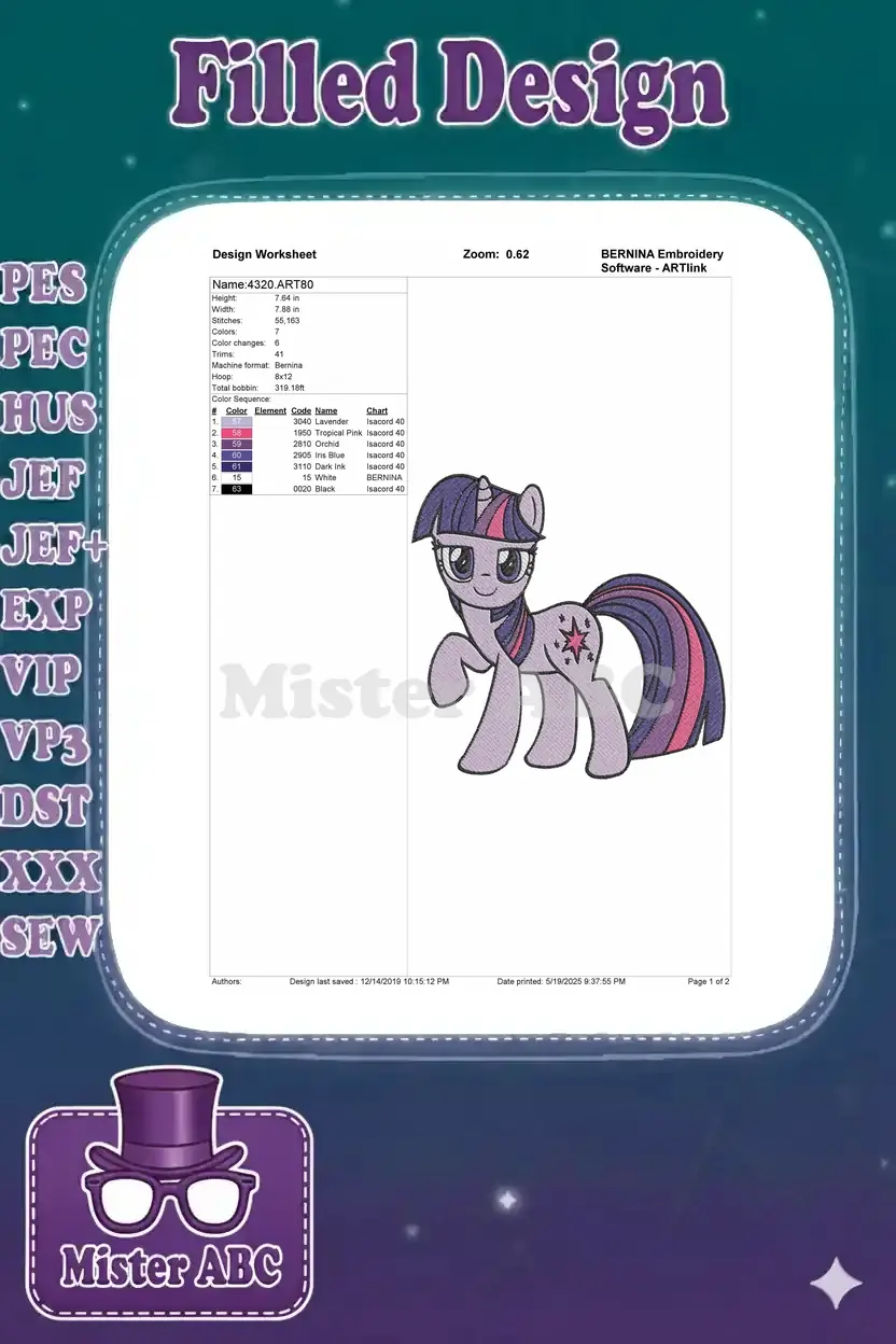 Smiling Twilight Sparkle My Little Pony purple unicorn embroidery designs
