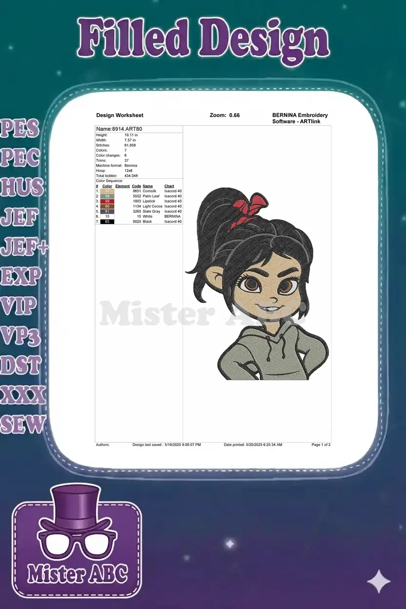 Smiling Vanellope Wreck-It Ralph cartoon character embroidery designs
