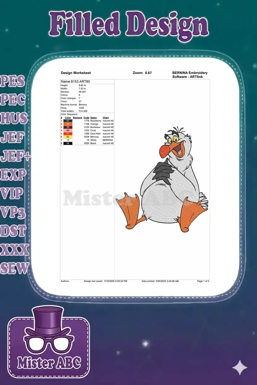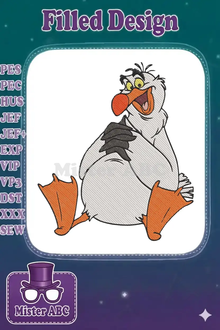 A delightful Scuttle pelican embroidery design, capturing his cheerful spirit for your next crafting project.