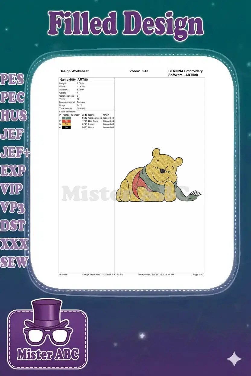 Smiling Winnie the Pooh bear wearing green scarf embroidery designs
