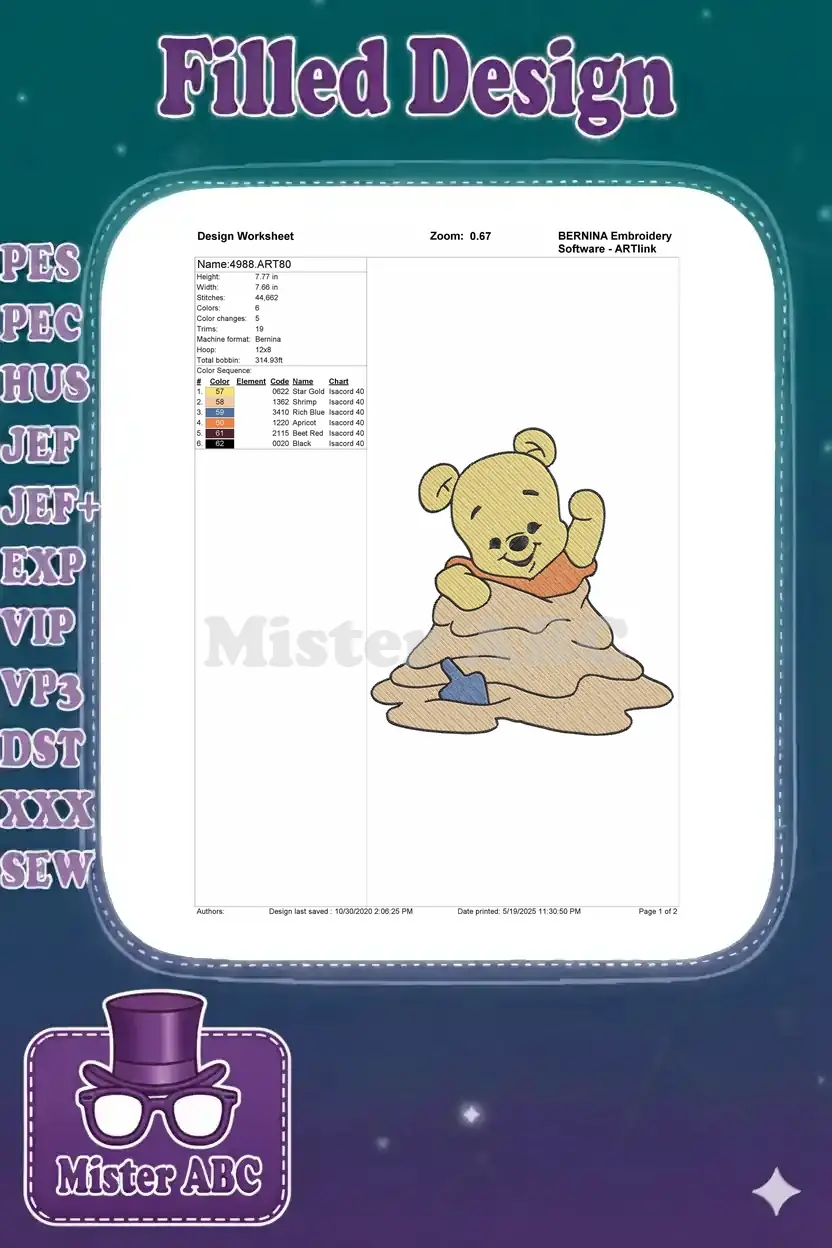 Smiling Winnie Pooh bear playing in the sand embroidery designs