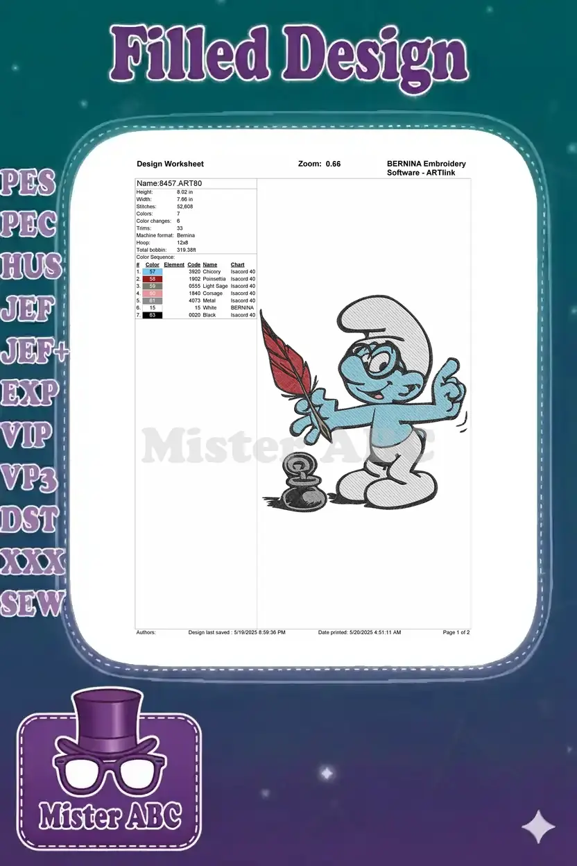 Capture the charm of a creative Smurf with this delightful embroidery design, perfect for fans and crafters alike. Bring this iconic character to life on your projects.