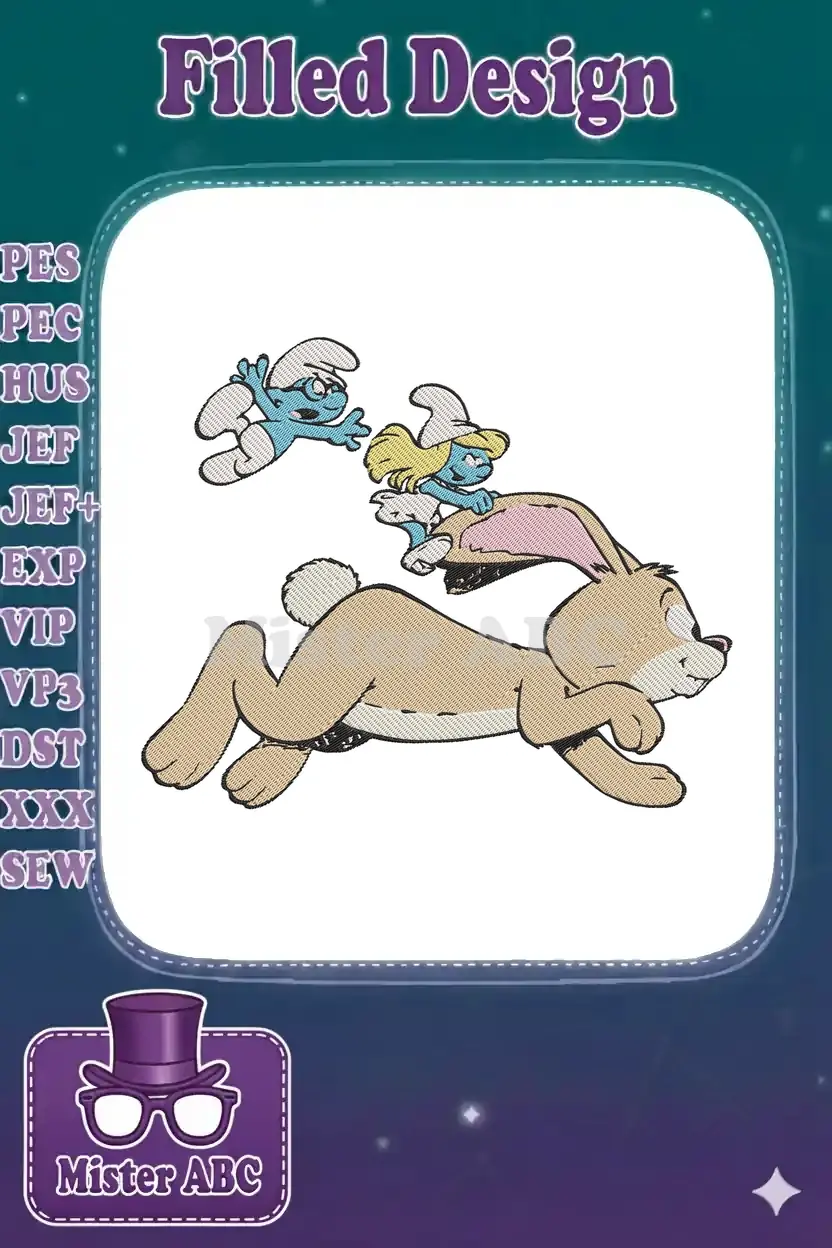 Smurfette and Brainy Smurf riding a running rabbit embroidery designs