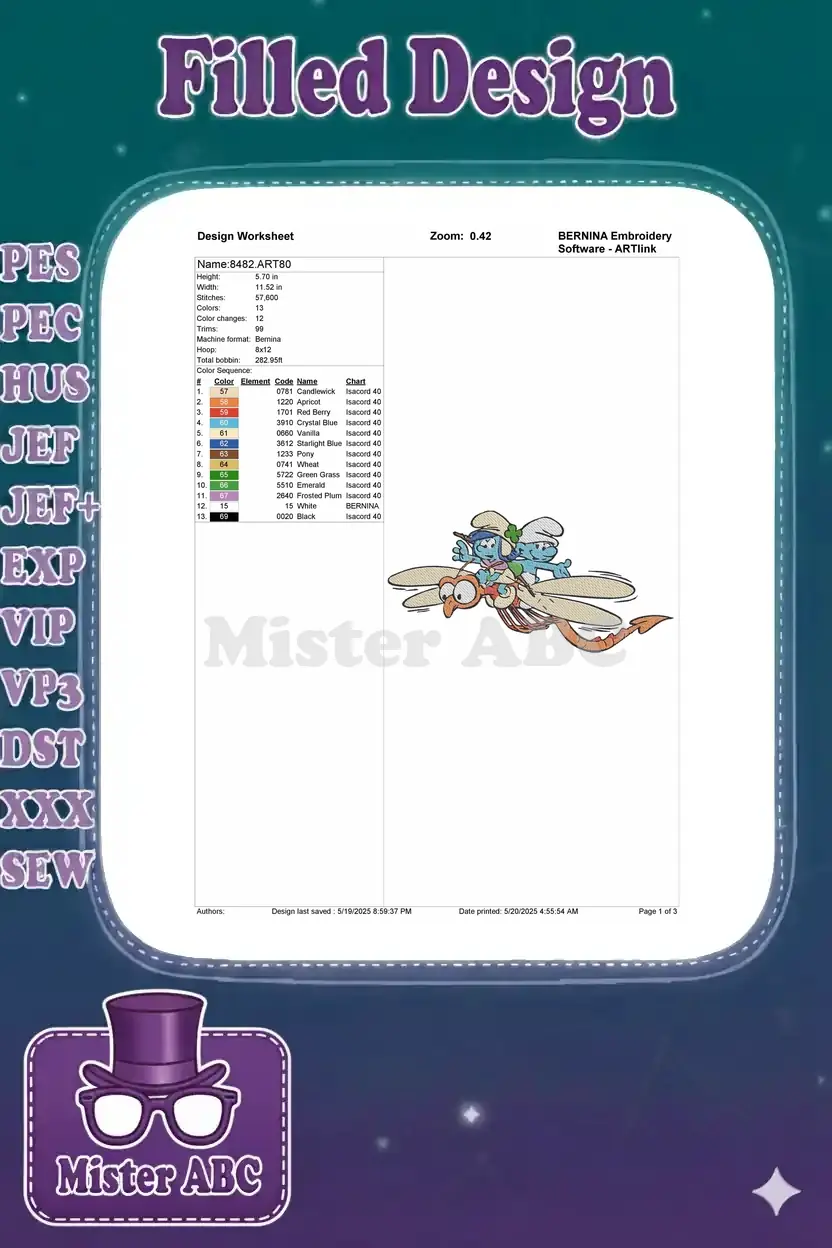 Smurfette and Smurf riding a dragonfly adventure embroidery designs