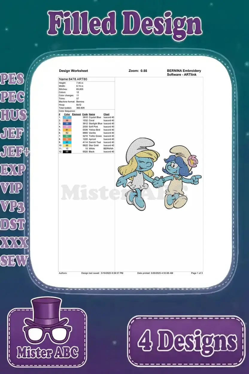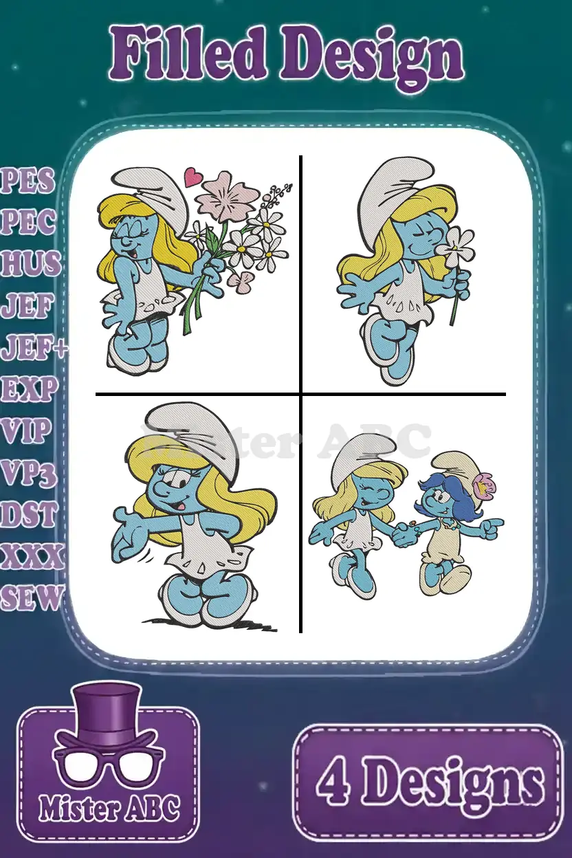 The Smurfs Smurfette With Flowers And With Papa Smurf And Hefty Smurf Character – Filled Embroidery Design