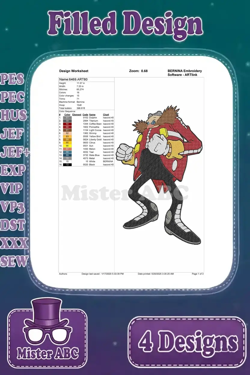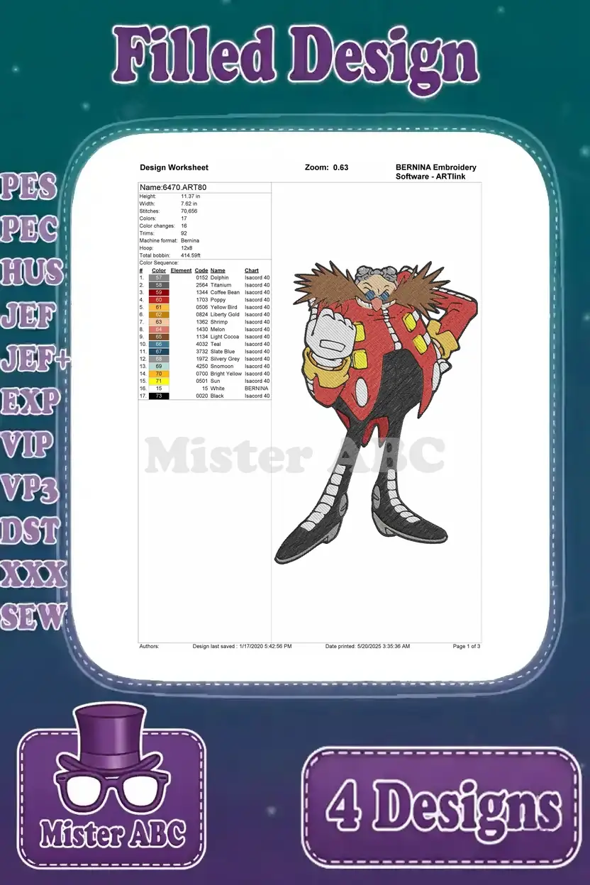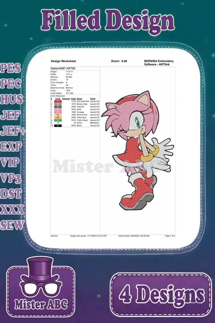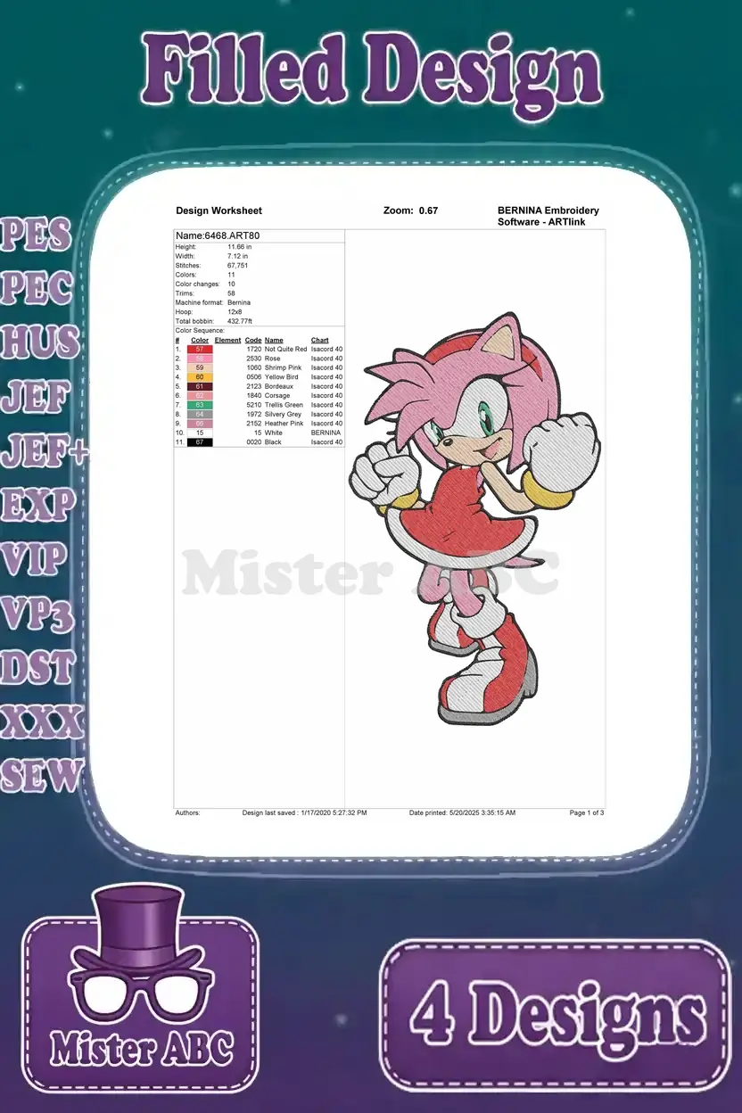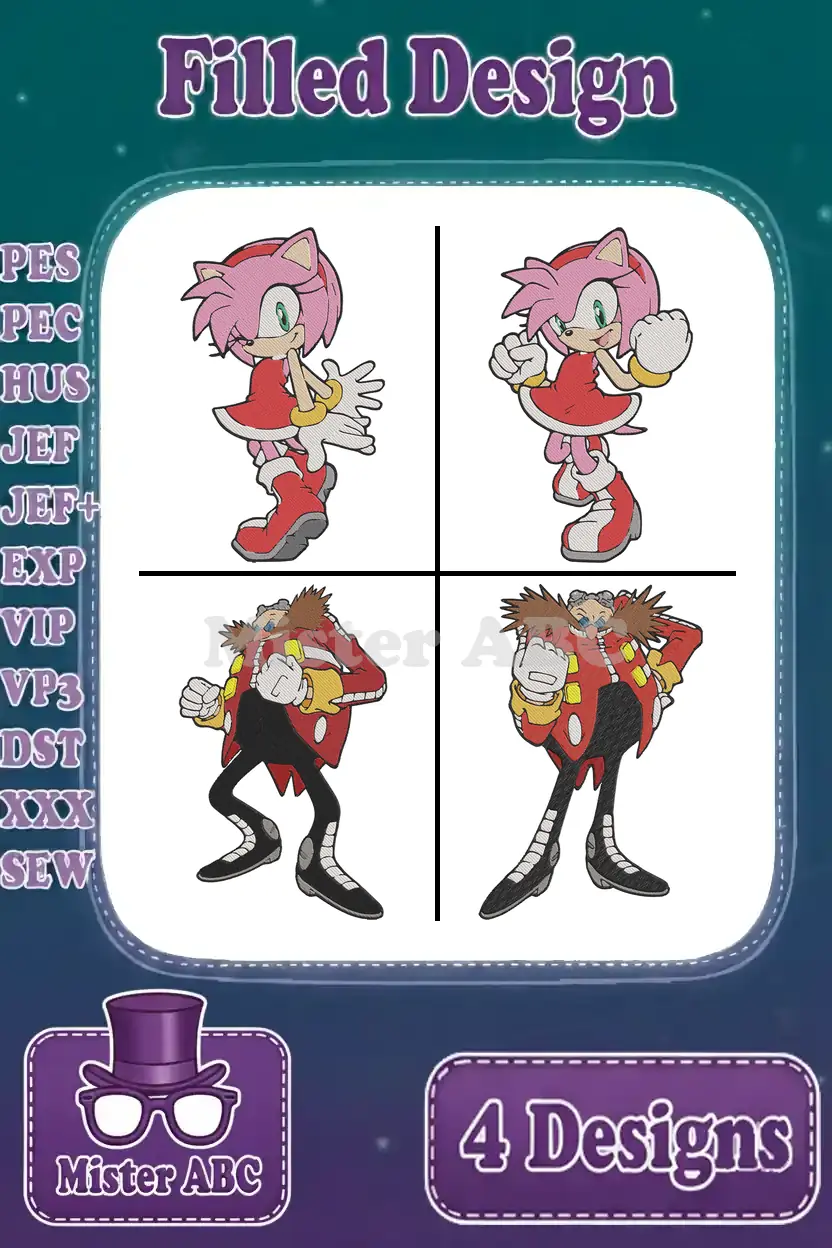 Sonic The Hedgehog Characters Amy Rose With Piko Hammer And Dr Eggman Villain – Filled Embroidery Design