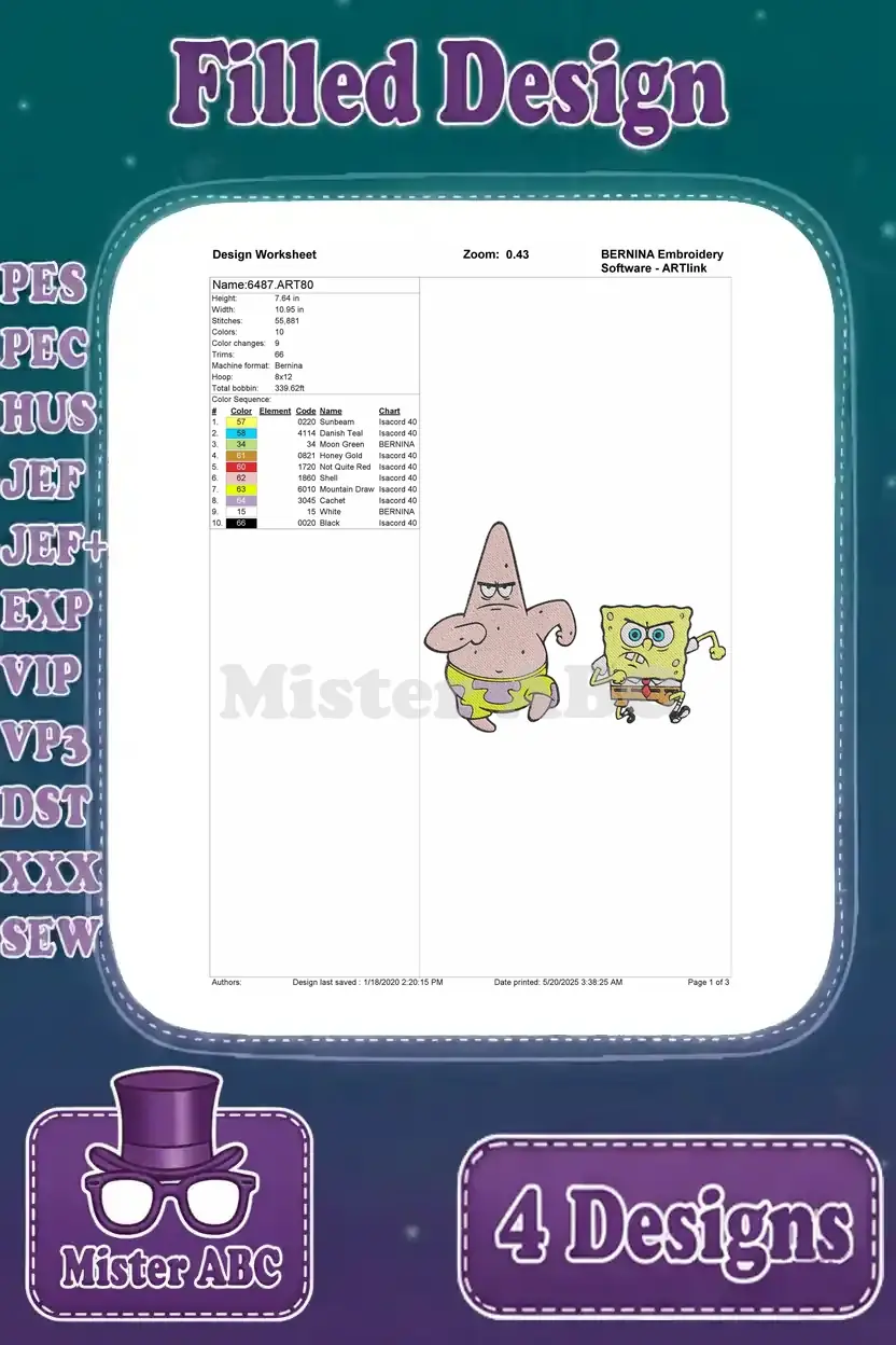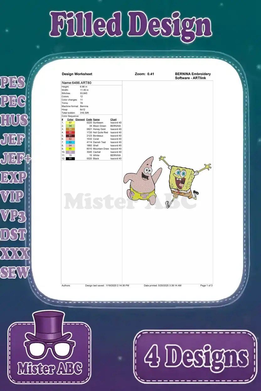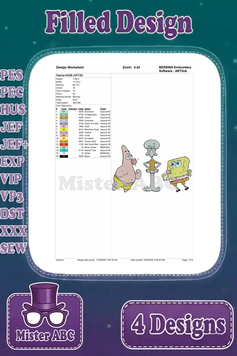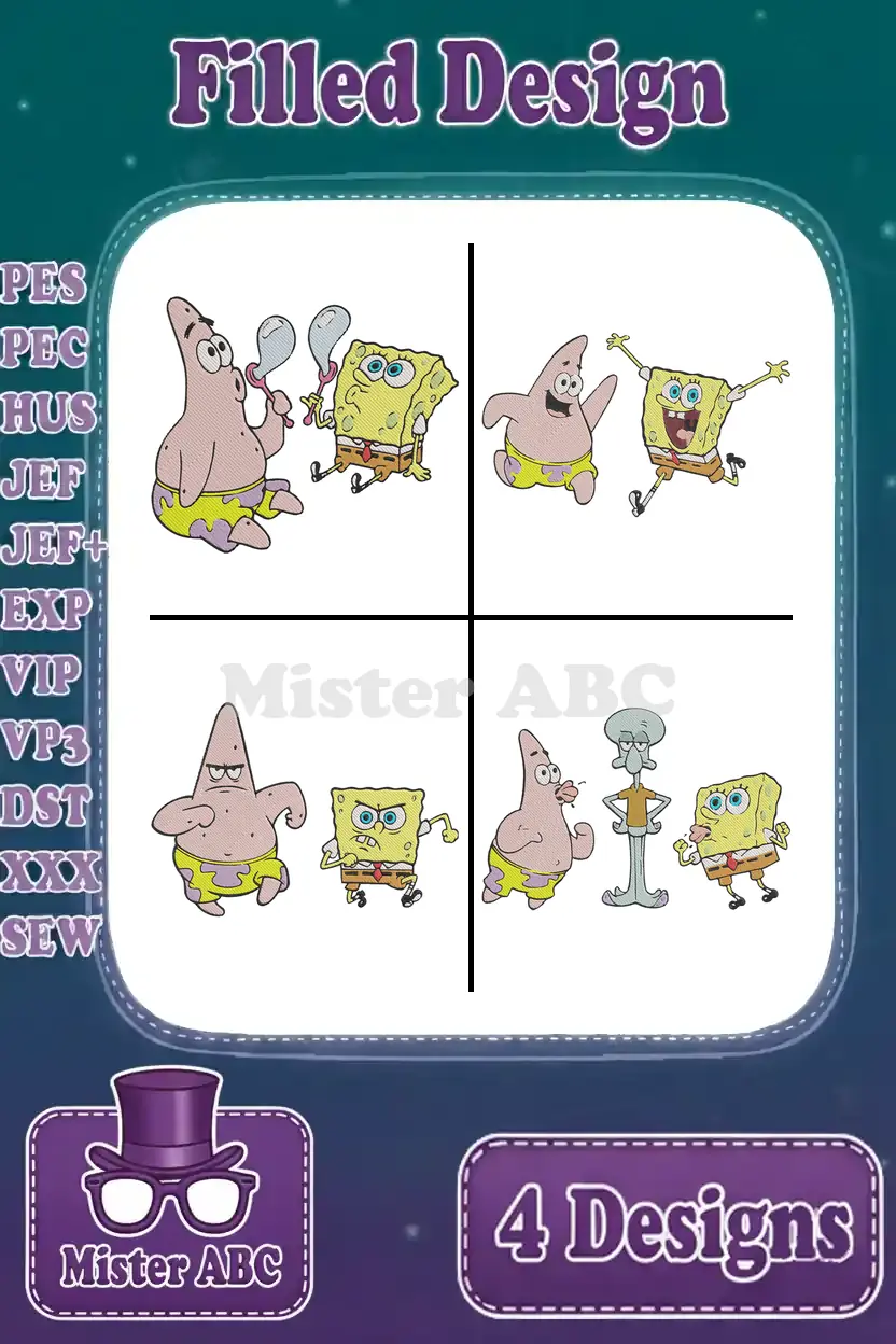Dive into Bikini Bottom fun with this 4-design embroidery bundle featuring SpongeBob, Patrick, and Squidward. Perfect for fans!