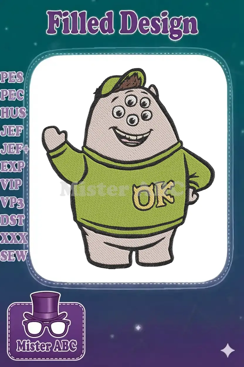 Squishy multi-eyed monster in green OK shirt embroidery designs