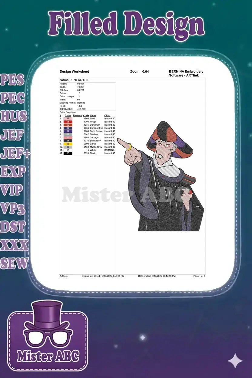 Stern Judge Frollo Disney villain character embroidery designs