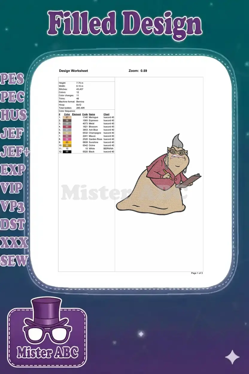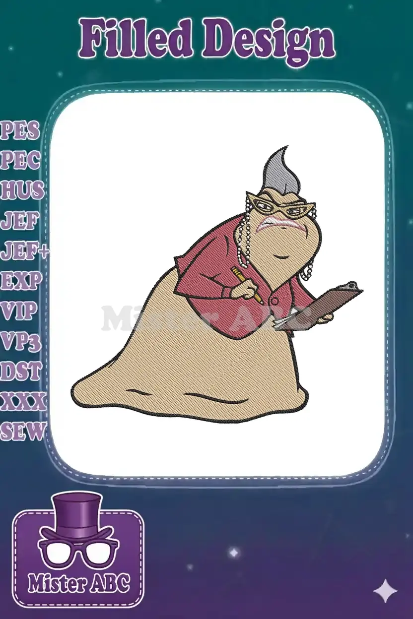 A captivating embroidery design of Roz from Monsters, Inc., perfectly capturing her iconic grumpy charm and detailed office attire.