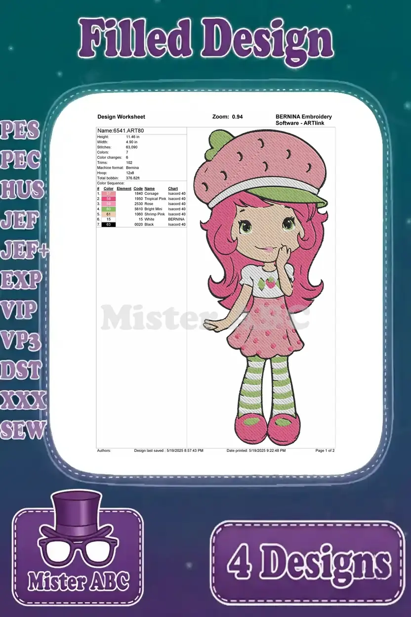 Strawberry Shortcake Classic Character Poses – Holding Basket And Sweet Smiles – Berry Sweet Girl – Filled Embroidery Design