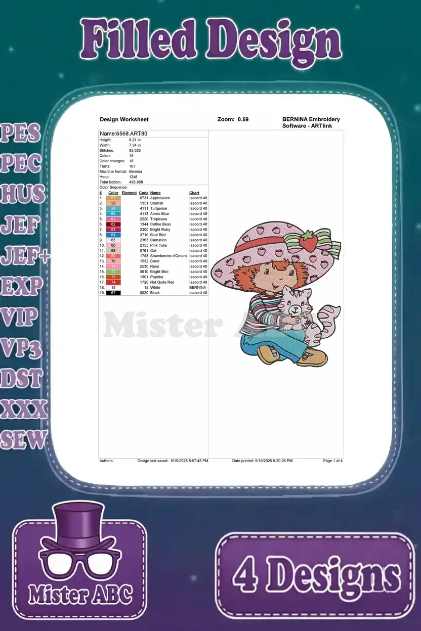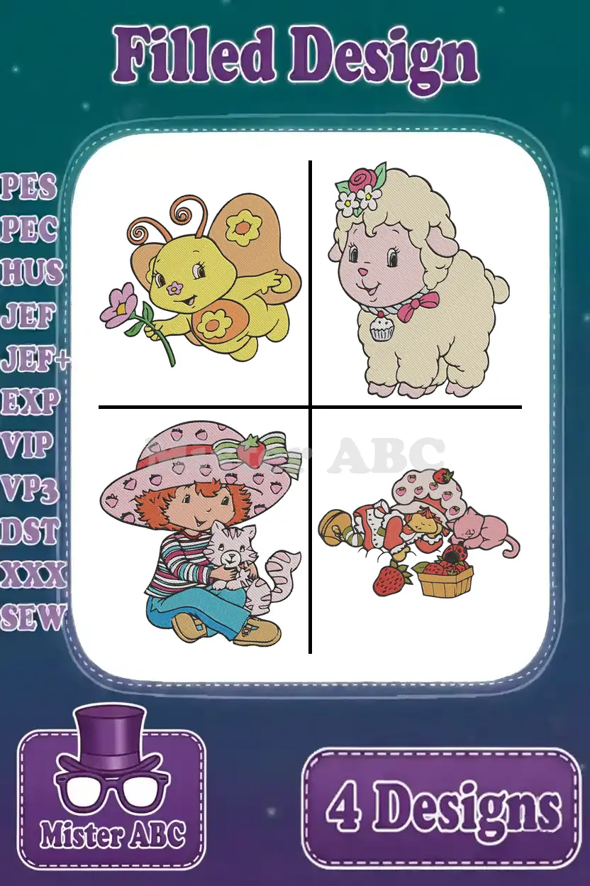 Strawberry Shortcake – Custard The Cat With Flowers – Pupcake The Dog With Berries – Berry Best Pets – Filled Embroidery Design