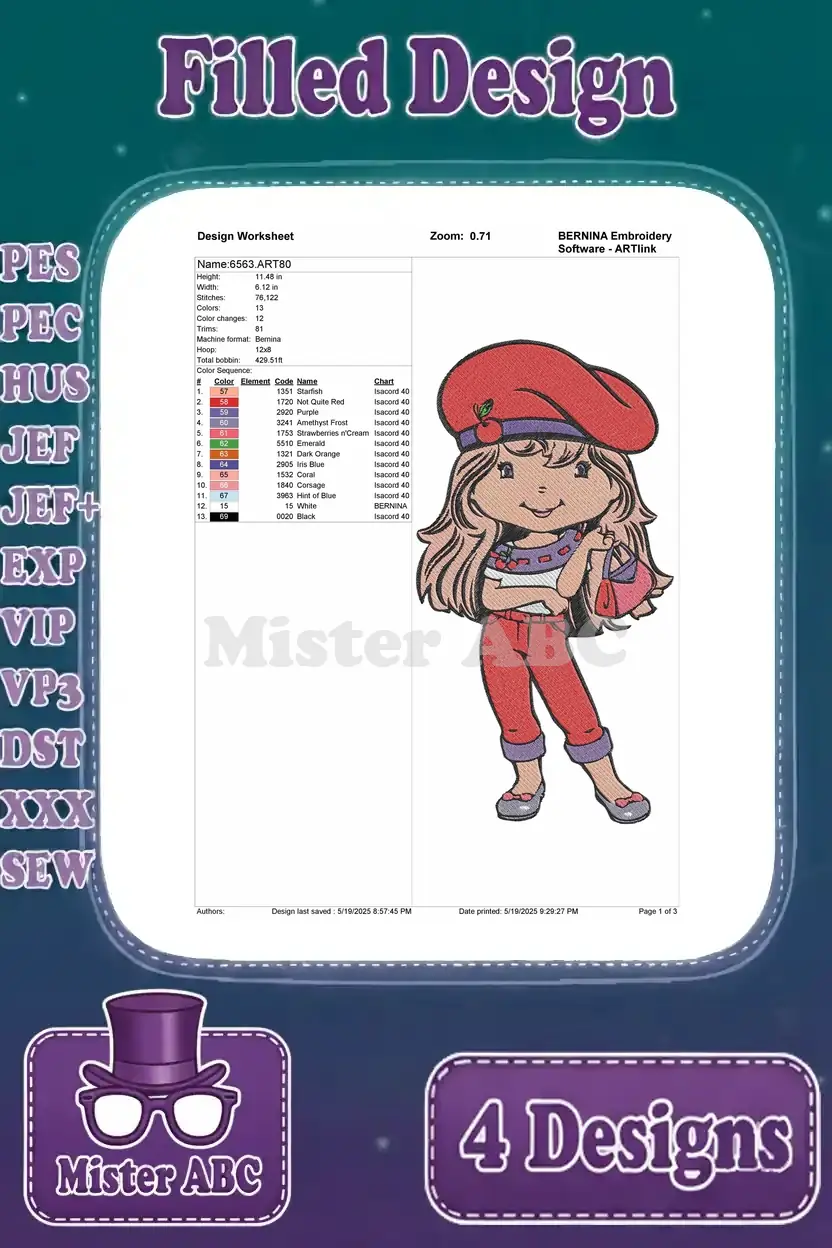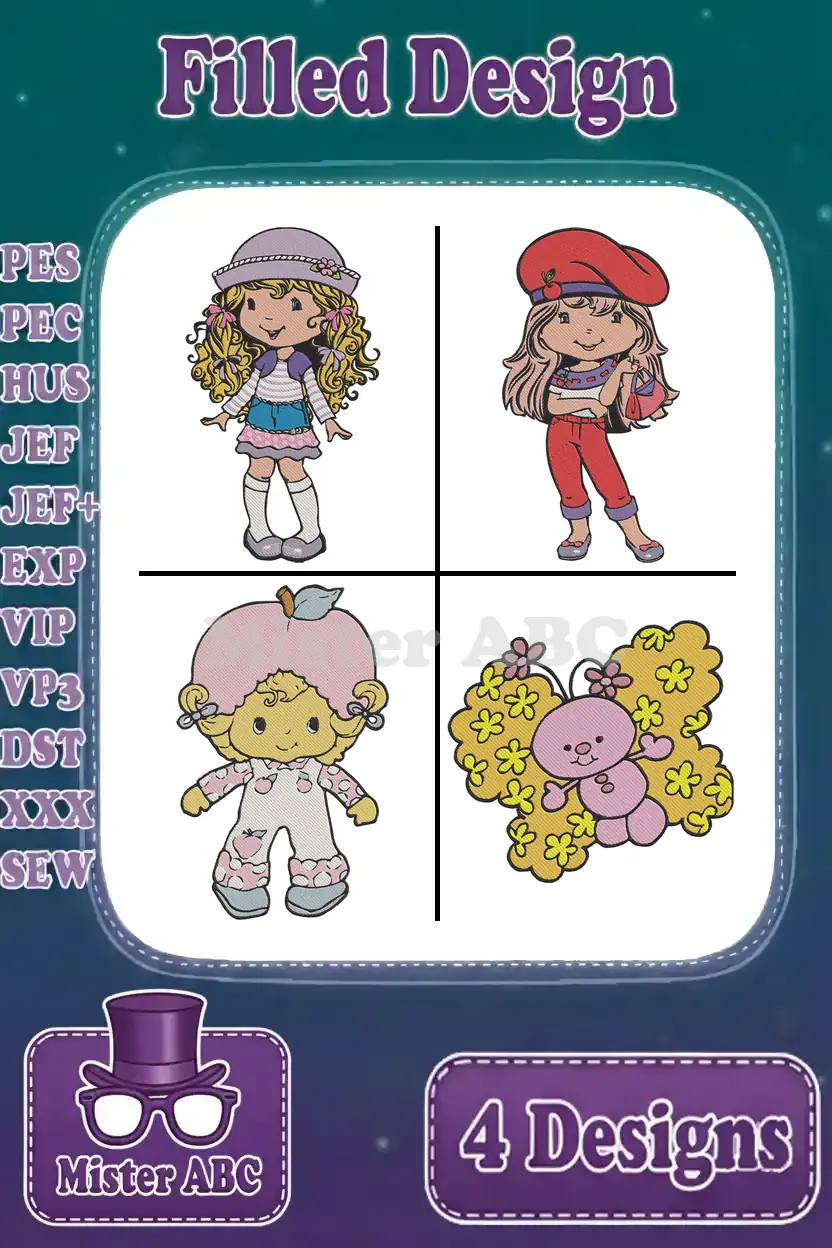 Strawberry Shortcake Friends – Crepes Suzette – Pink Haired Girl With Cloud – Purple Haired Skater – Sweet Style – Filled Embroidery Design