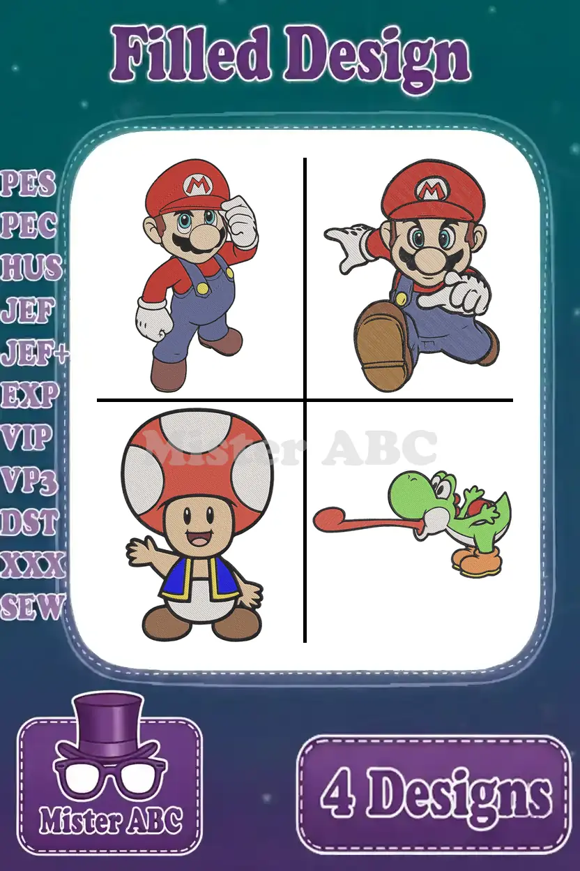 Super Mario Universe – Mario Jumping And Standing – Toad And Yoshi The Dinosaur – Beloved Nintendo Characters – Filled Embroidery Design