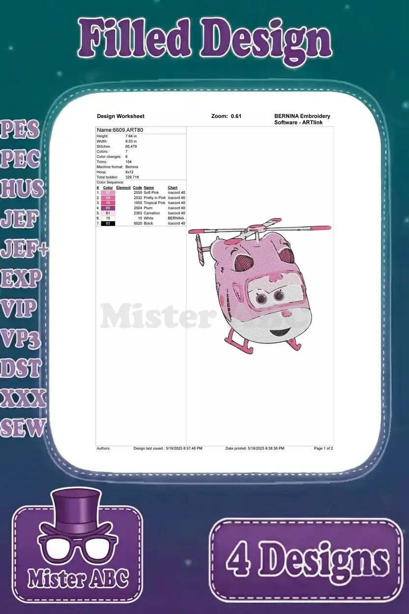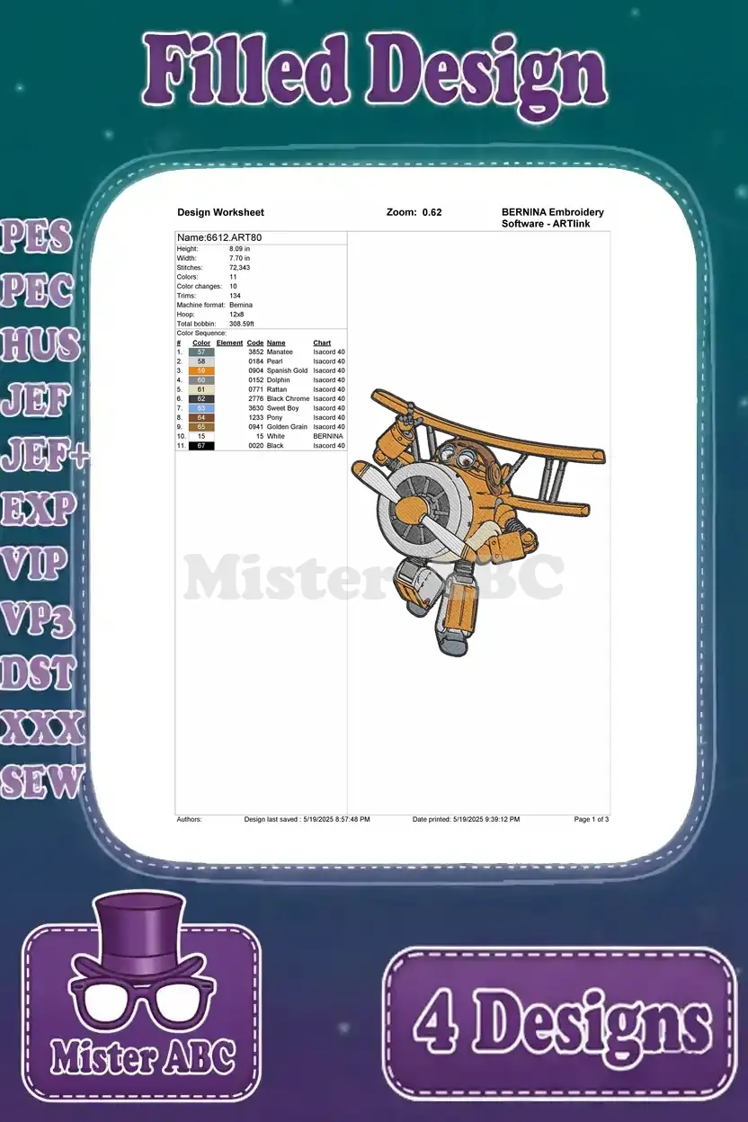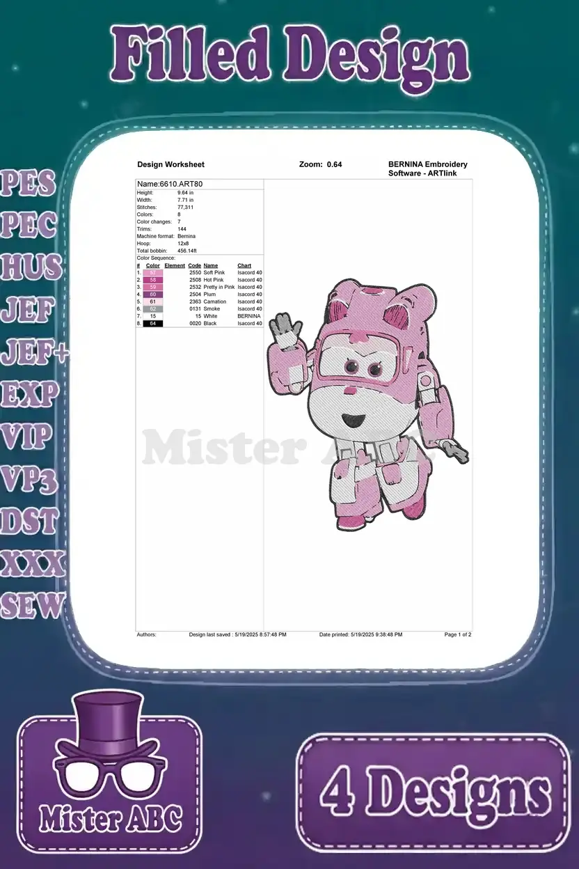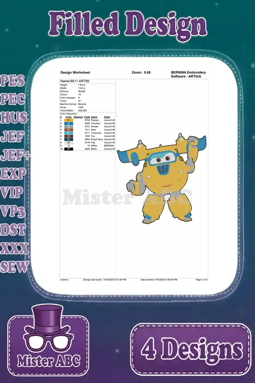 Super Wings Planes Dizzy Pink Helicopter Donnie Yellow Jett Red Jerome Orange Collection – Filled Embroidery Design