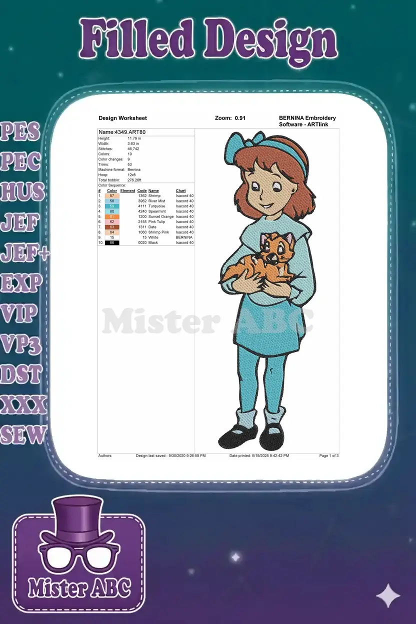 Sweet animated girl holding a playful orange kitten embroidery designs