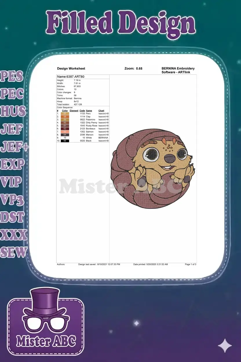 Sweet Brown Armadillo Baby Animal Smiling Face Embroidery Designs