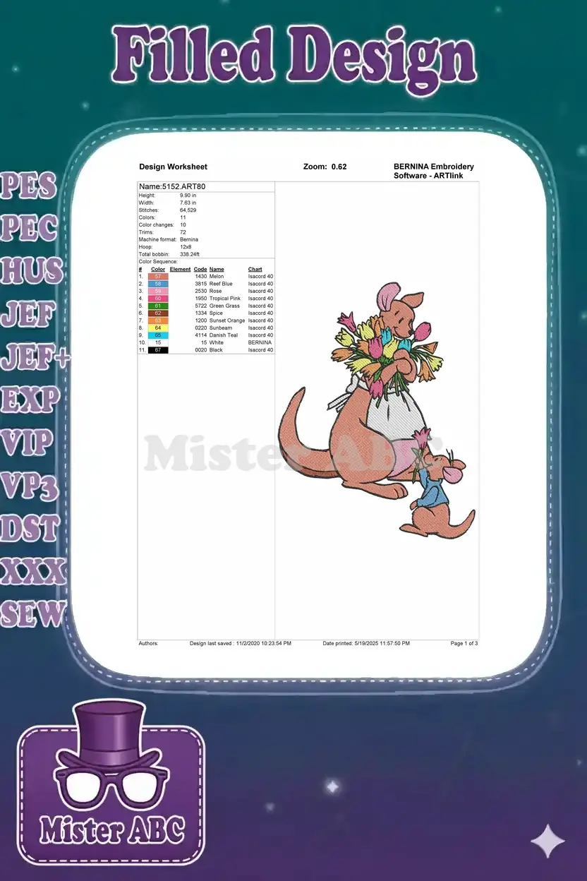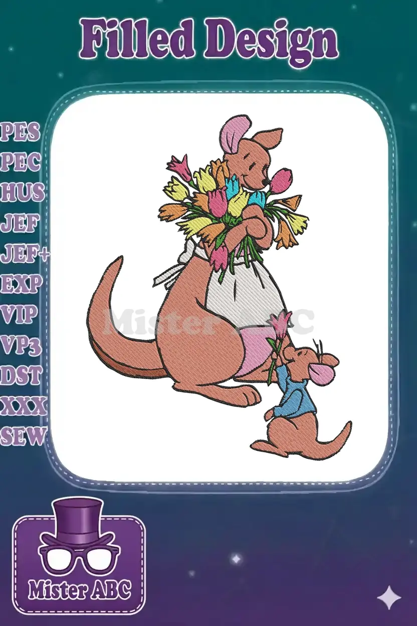Sweet Mother Kangaroo and Joey with Colorful Flowers Embroidery Designs