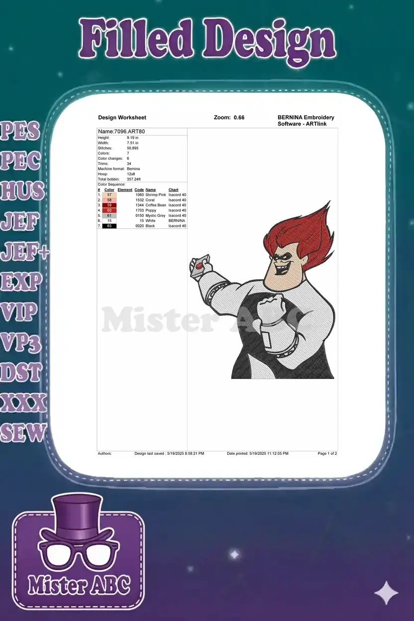 Syndrome Incredibles Supervillain Red Hair Powerful Pose Embroidery Designs