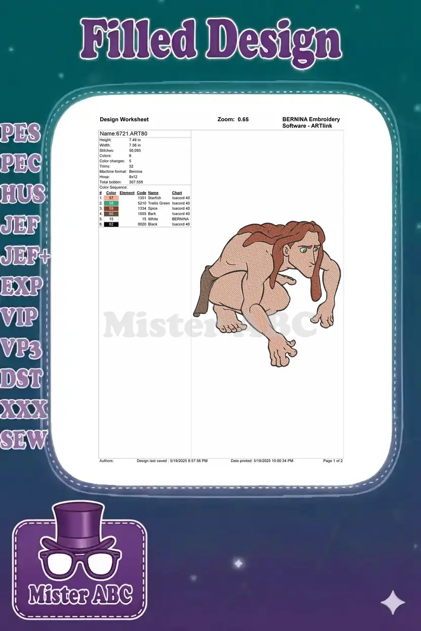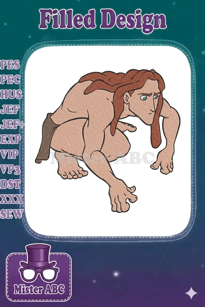 Tarzan in a dynamic crouching pose, perfect for fans of jungle adventures. A detailed embroidery design capturing his wild spirit.