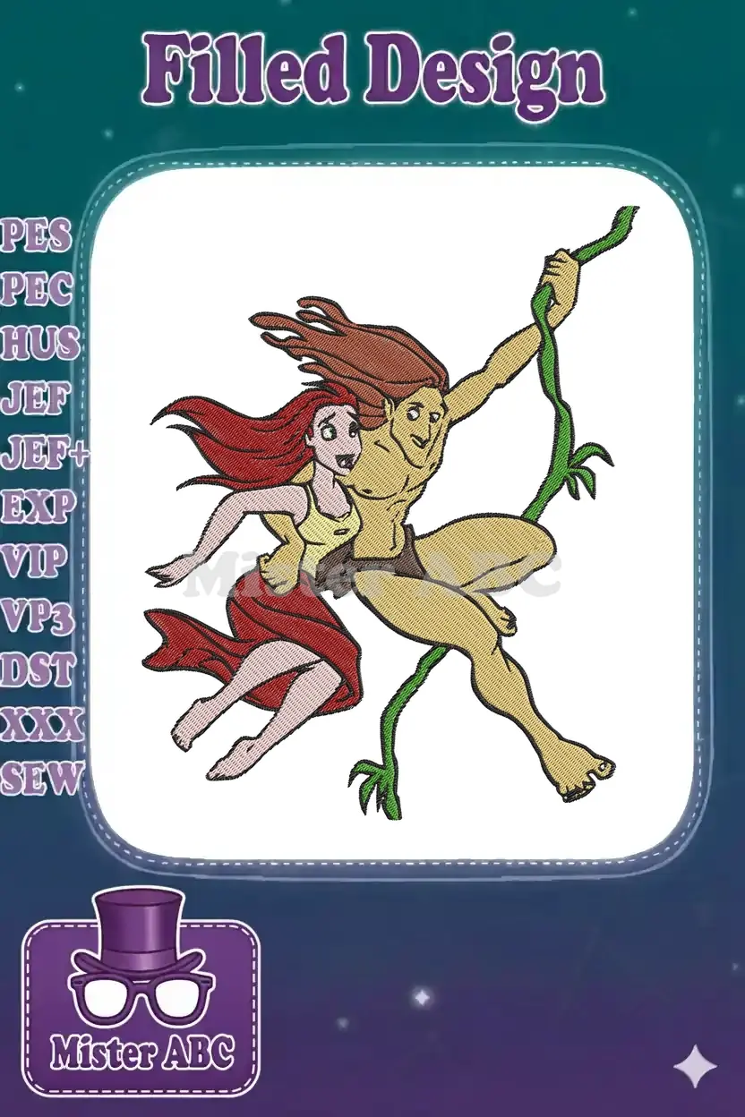 Tarzan and Jane Jungle Vine Swinging Couple Embroidery Designs