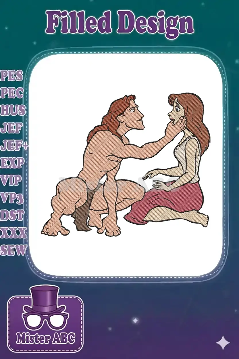 Capture the romance of the jungle with this exquisite embroidery design featuring Tarzan and Jane’s tender embrace. Perfect for fans!