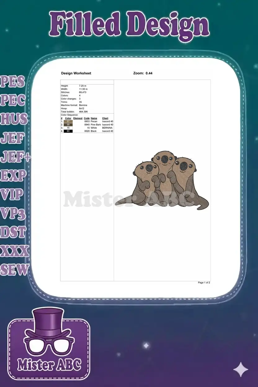 Three Cute Baby Otters Hugging Embroidery Designs for Apparel