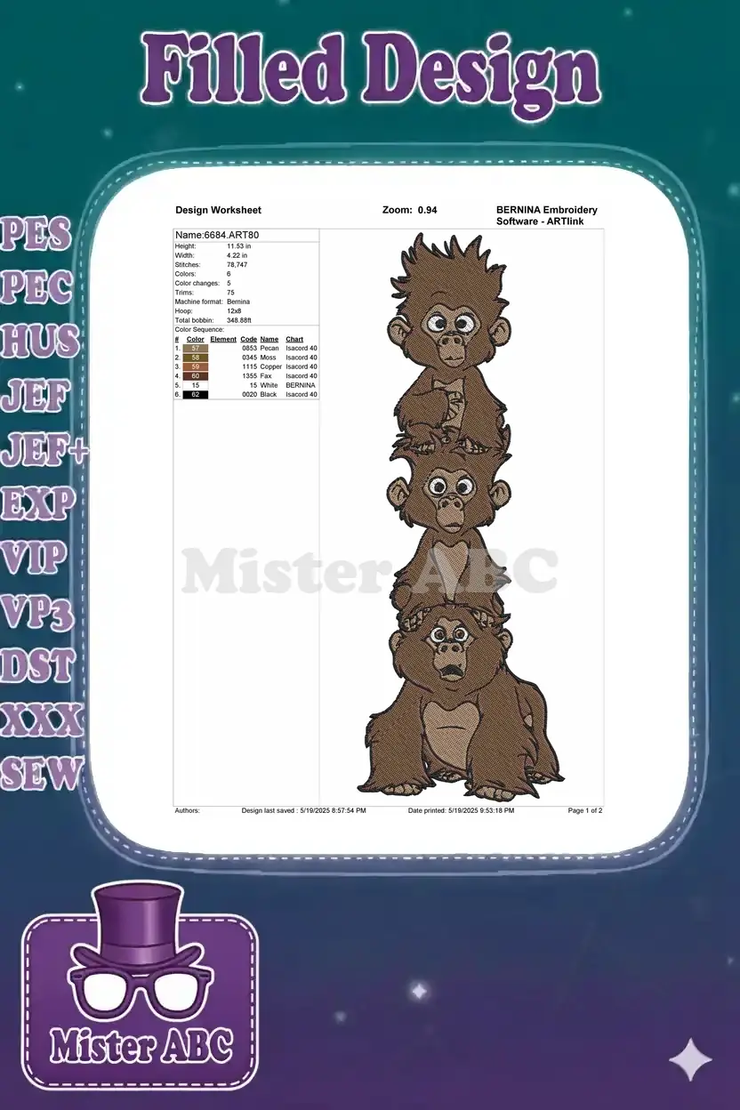 Three funny brown cartoon monkeys stacked embroidery designs