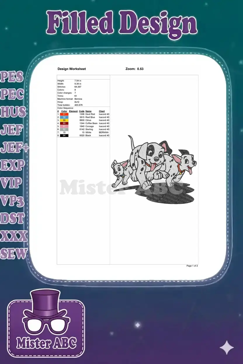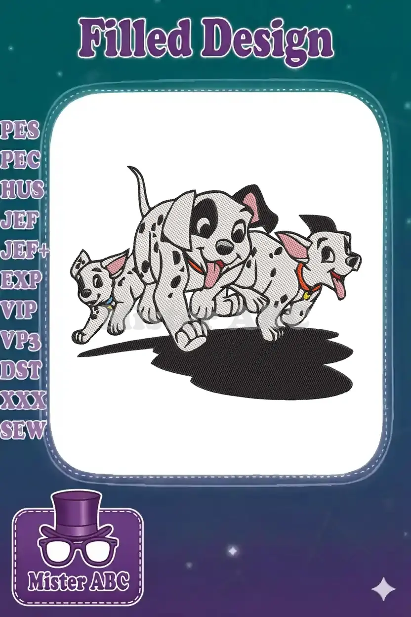 Three happy playful Dalmatian puppies running embroidery designs