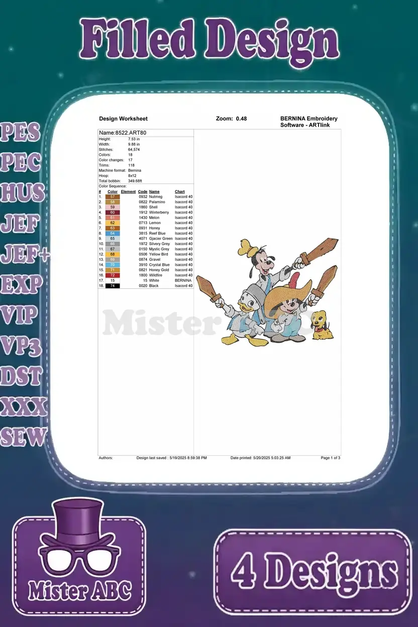Three Musketeers Mickey Donald Goofy Minnie Daisy Clarabelle Royal Characters – Filled Embroidery Design – Instant Download
