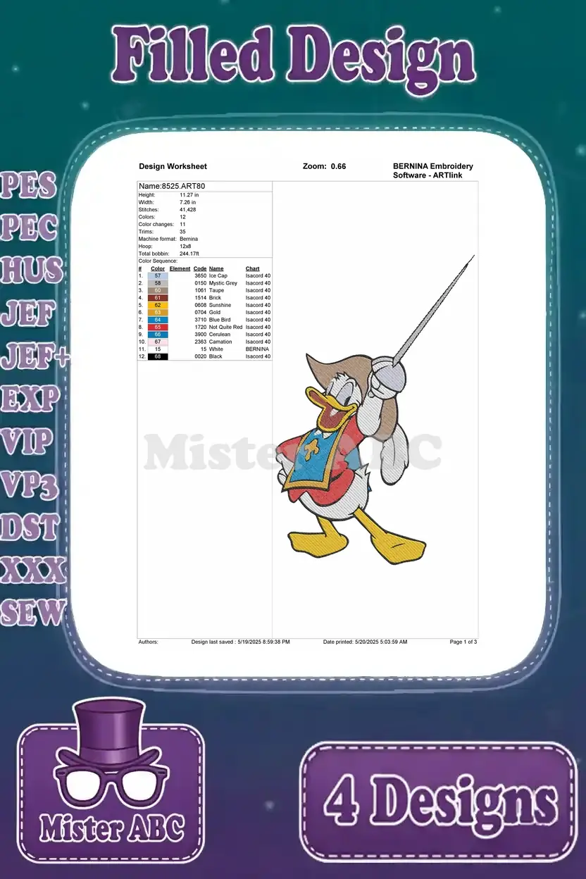 Three Musketeers Mickey Donald Goofy Minnie Daisy Clarabelle Royal Characters – Filled Embroidery Design