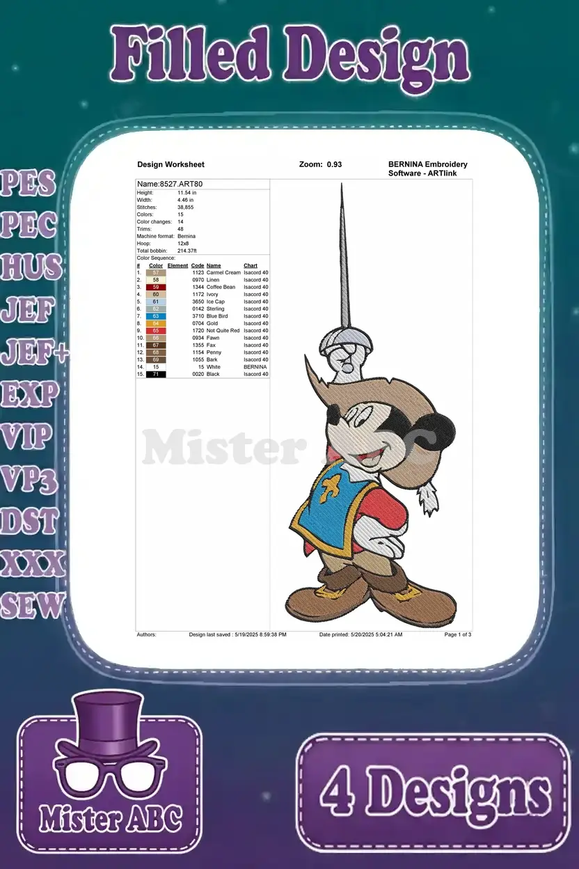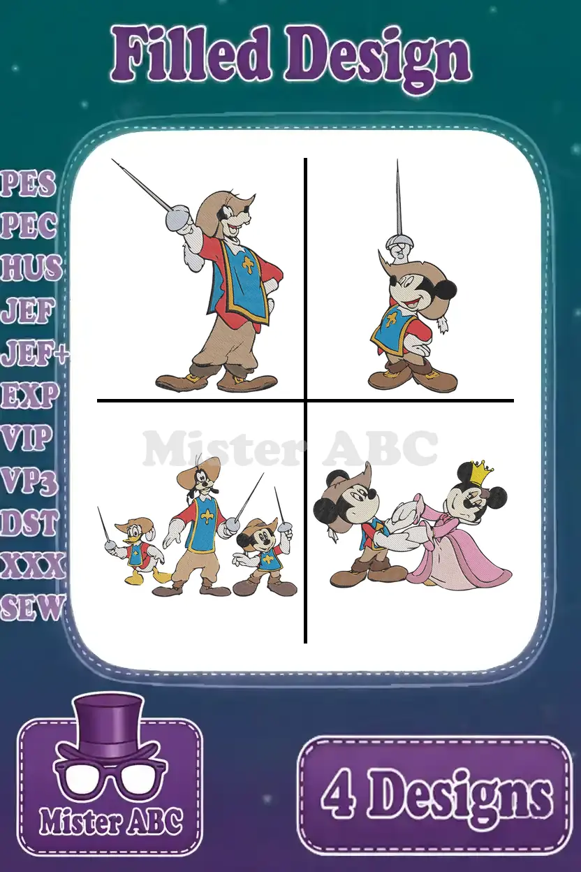 Three Musketeers Mickey Mouse Donald Duck Goofy And Minnie Mouse Adventure – Filled Embroidery Design