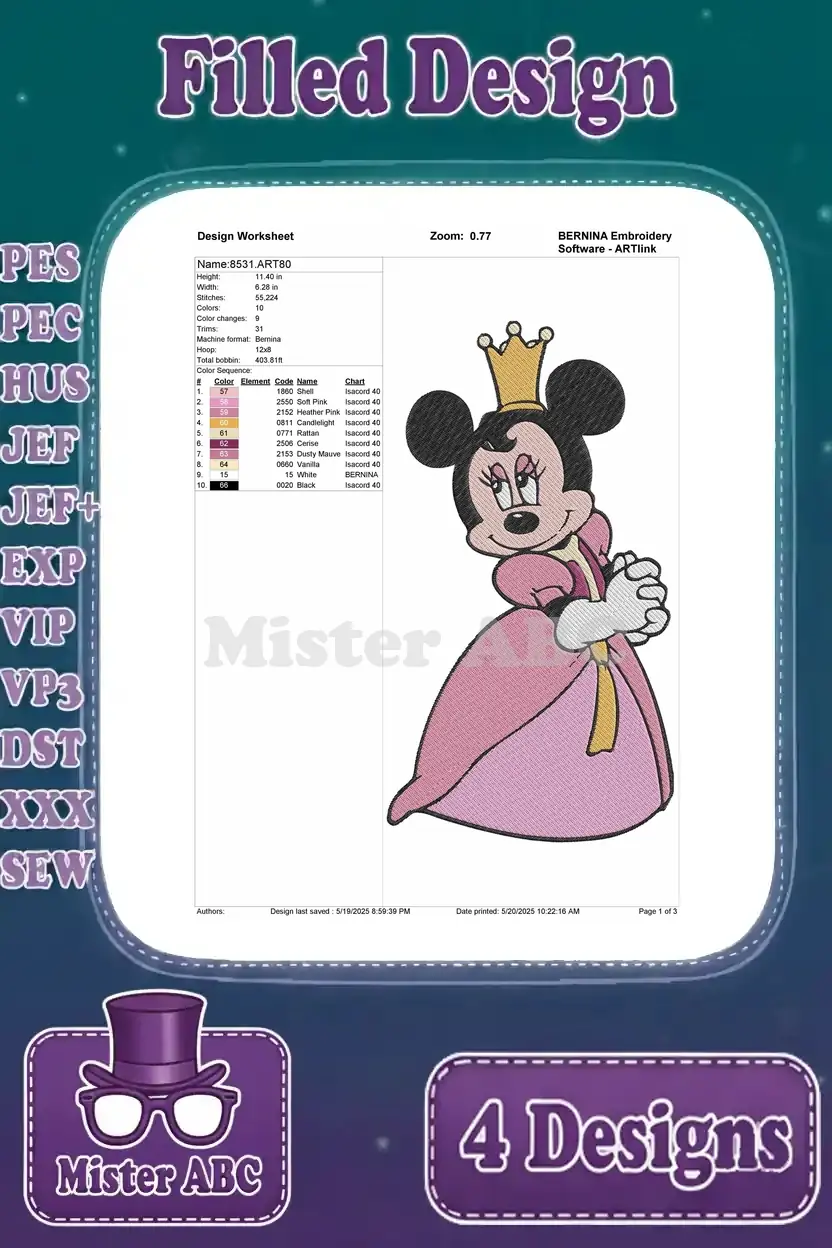 Three Musketeers Minnie Mouse As Princess And Pete As Captain Of The Guards – Filled Embroidery Design – Instant Download