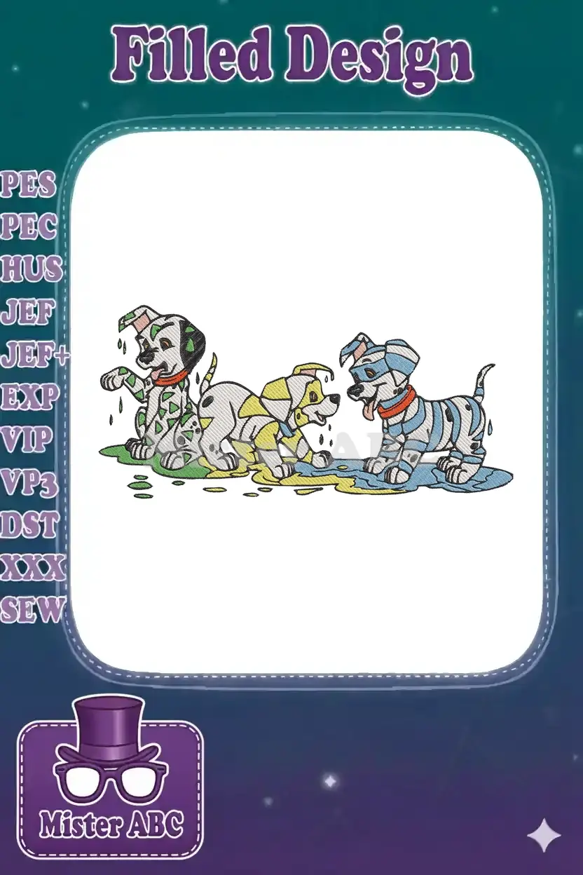 Three playful puppies making a colorful paint mess embroidery designs