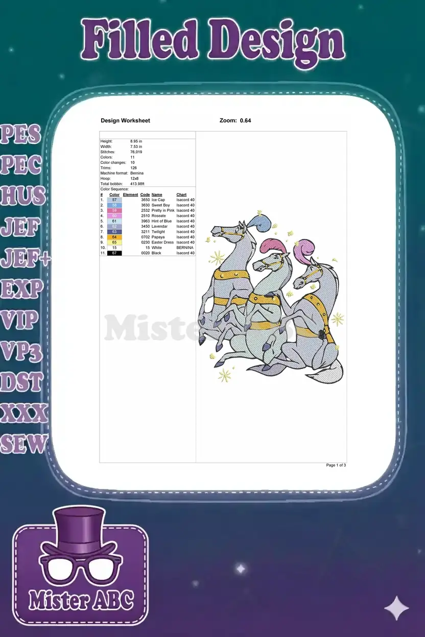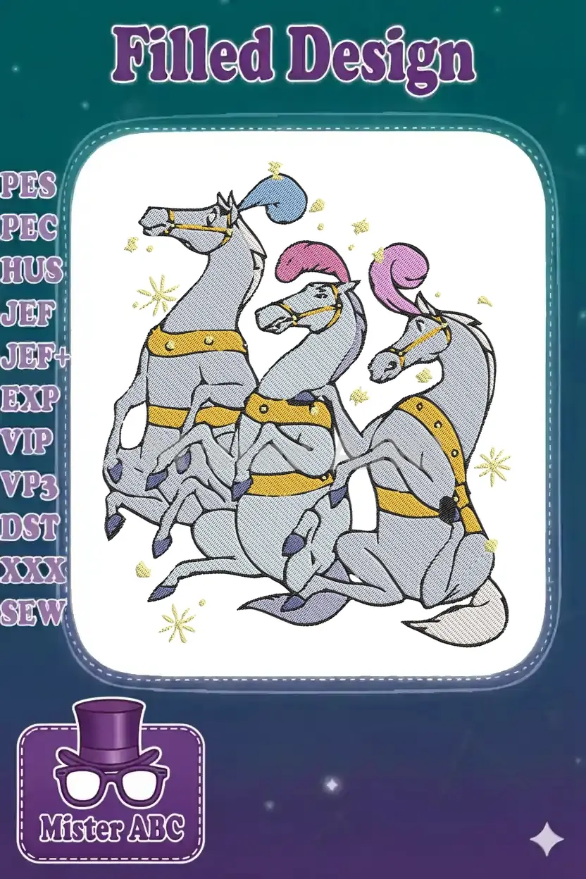 Three whimsical grey horses with colorful plumes embroidery designs