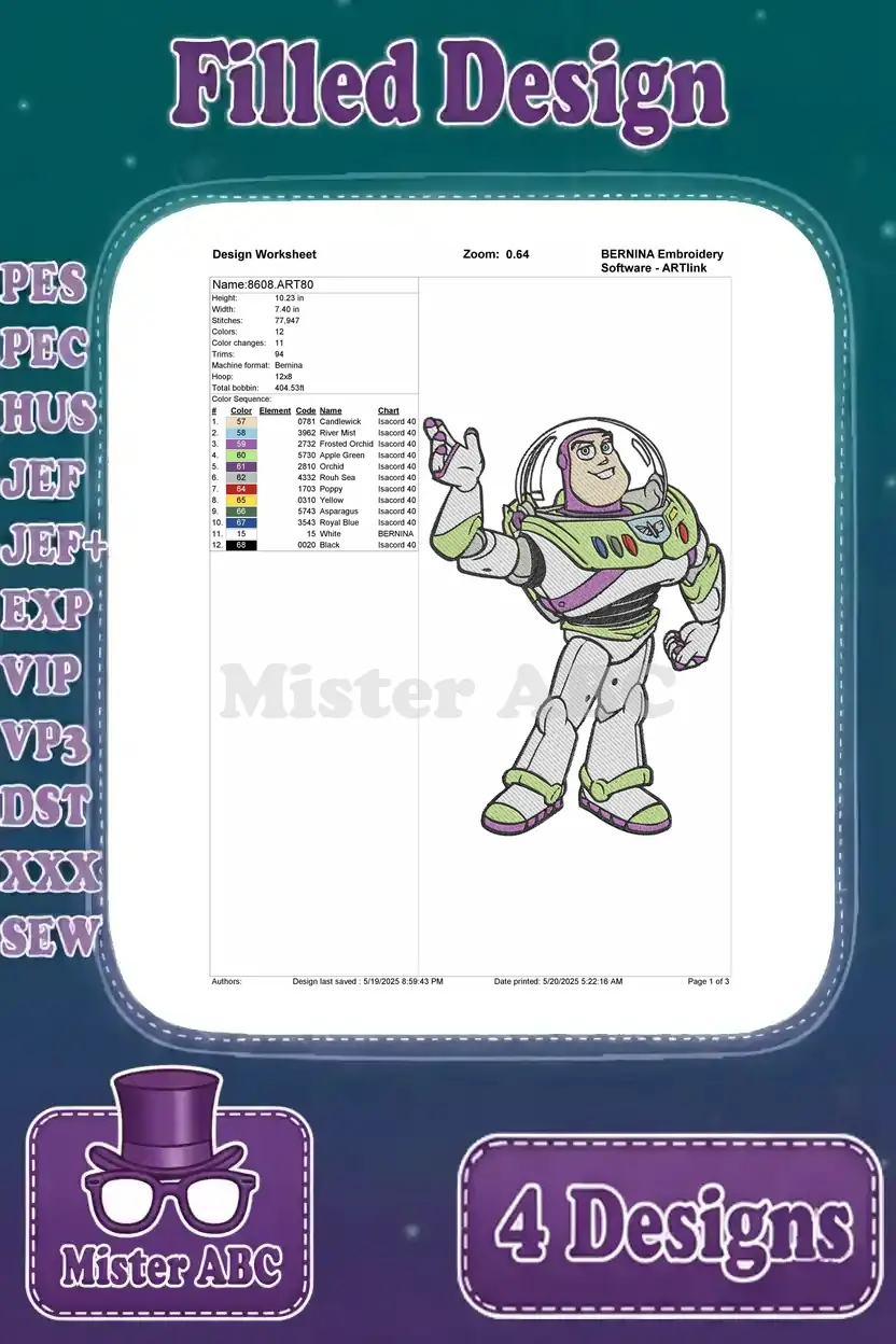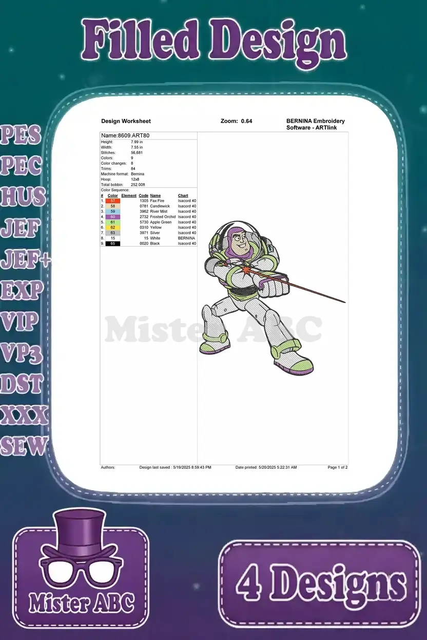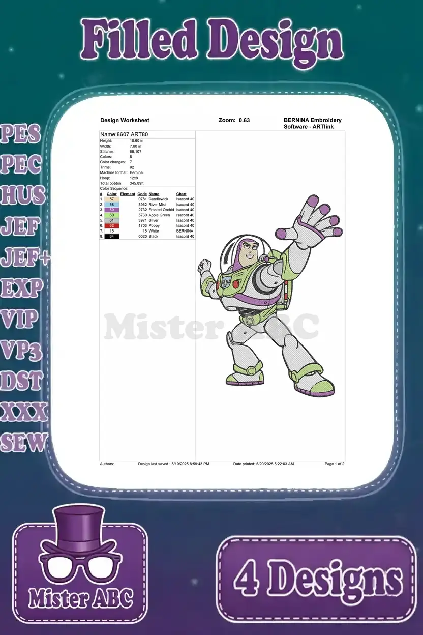 Toy Story – Buzz Lightyear Space Ranger Hero – Posing With Laser And Name Tag – Pixar Character – Filled Embroidery Design