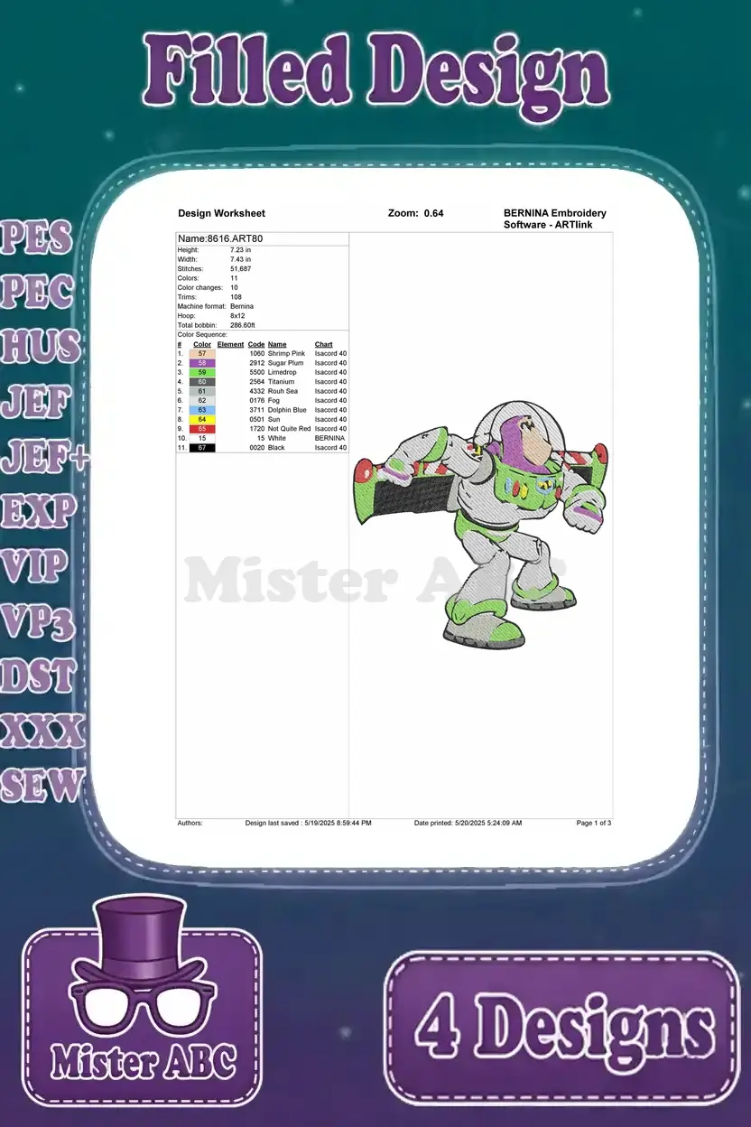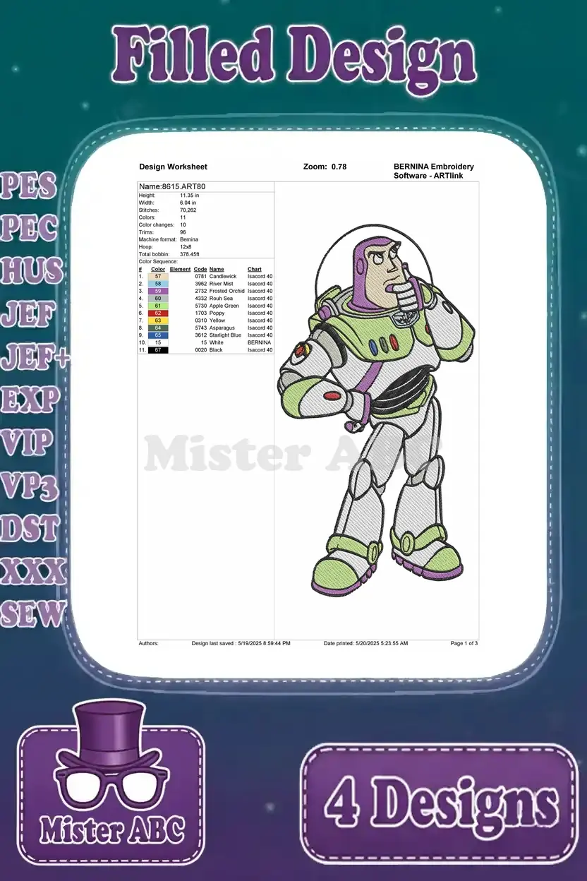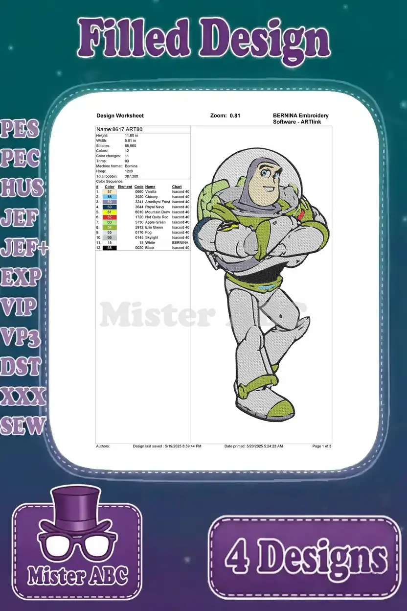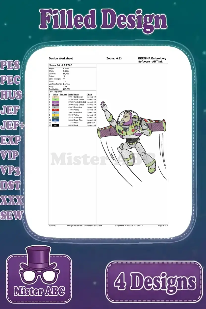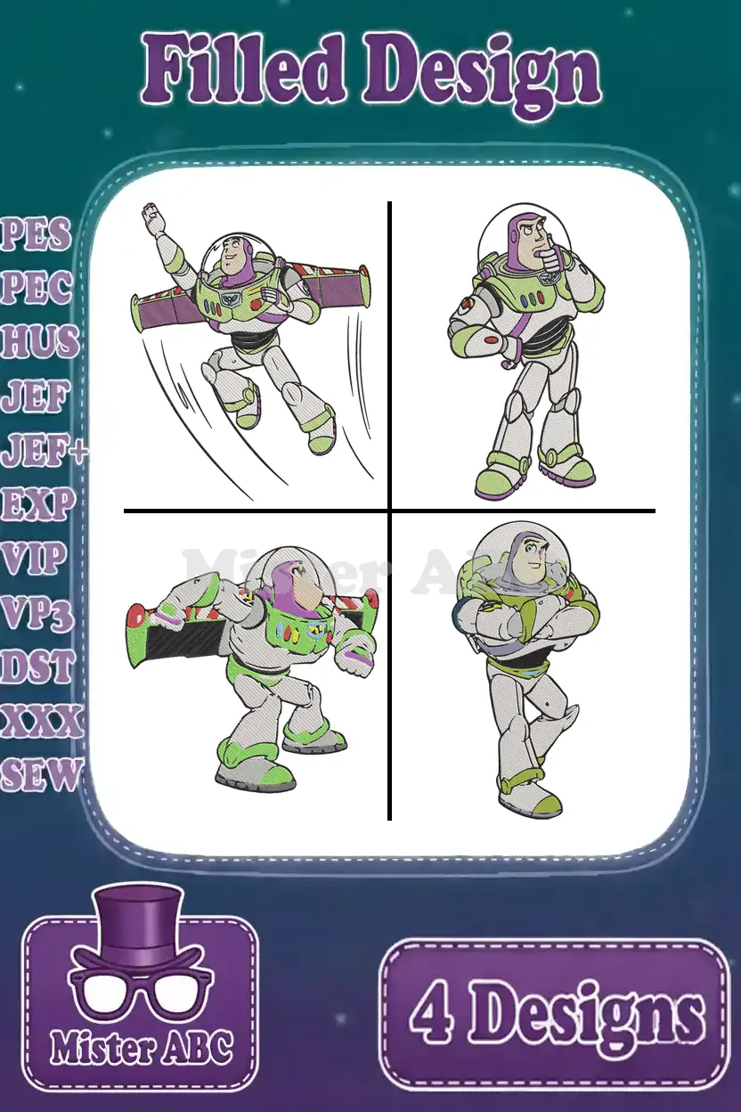 Toy Story – Buzz Lightyear Flying And Standing Poses – Space Ranger Ready For Action – Pixar Hero – Filled Embroidery Design