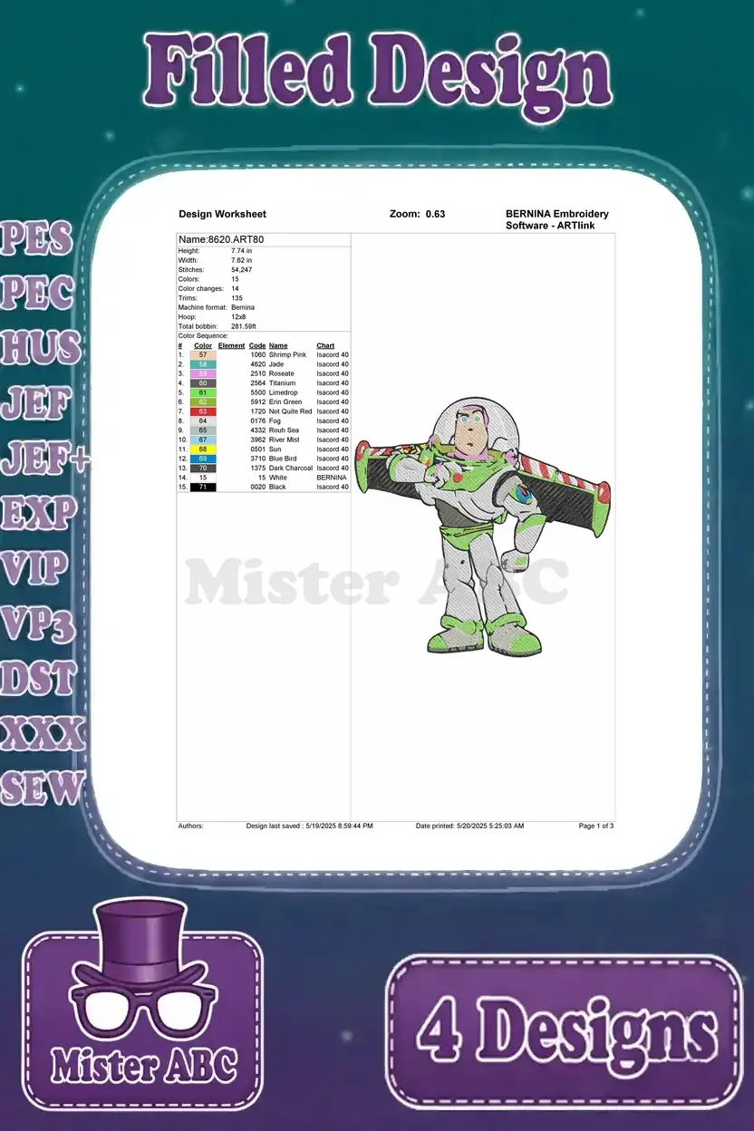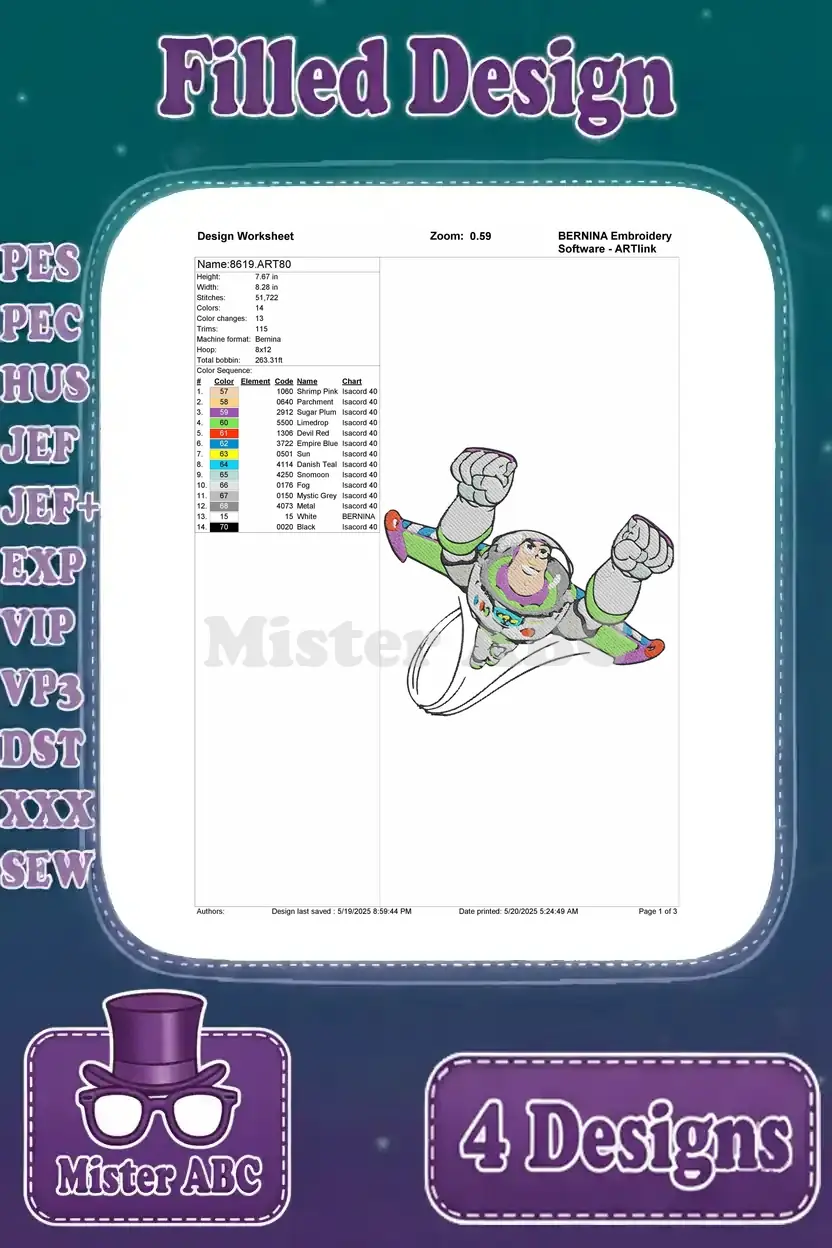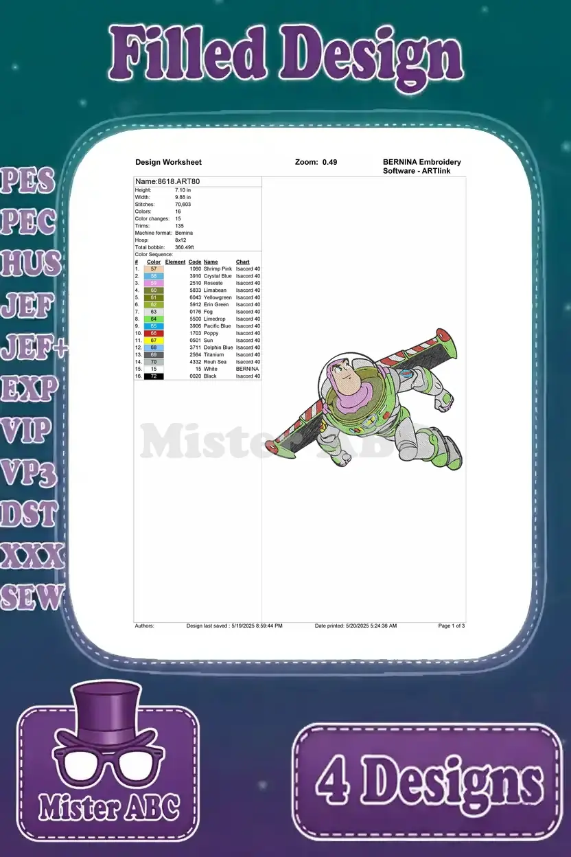 Toy Story – Buzz Lightyear With Wings Extended – Flying And Action Poses – Space Adventure Hero – Filled Embroidery Design