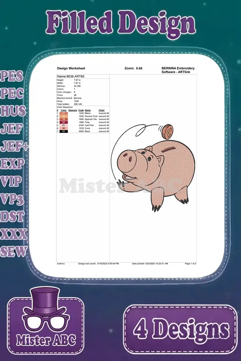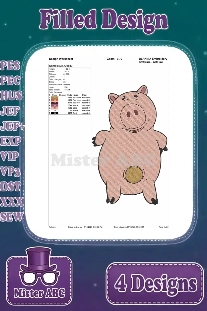 Toy Story – Hamm The Piggy Bank With Cone Hat And Money Slot – Pixar Character Standing Poses – Filled Embroidery Design