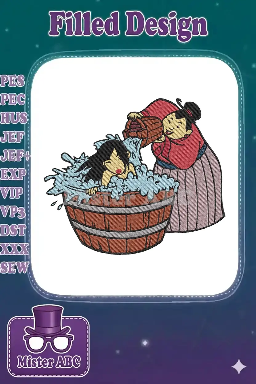 Traditional Asian women bathing in wooden tub embroidery designs