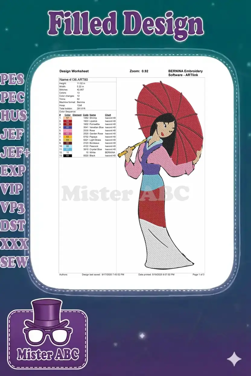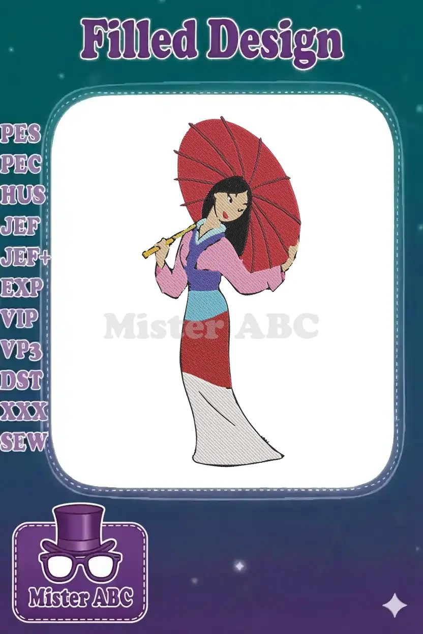 Traditional Chinese Mulan Princess Red Parasol Embroidery Designs