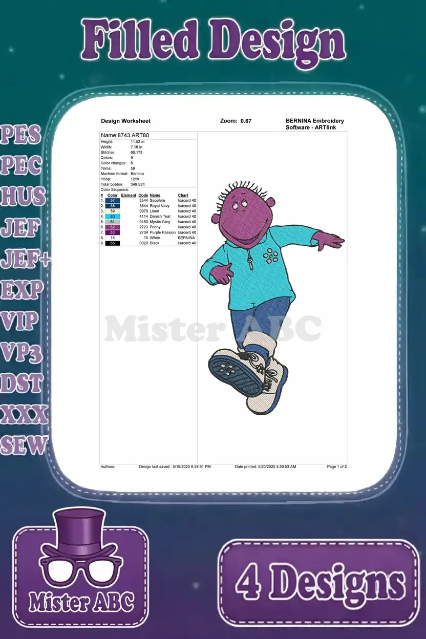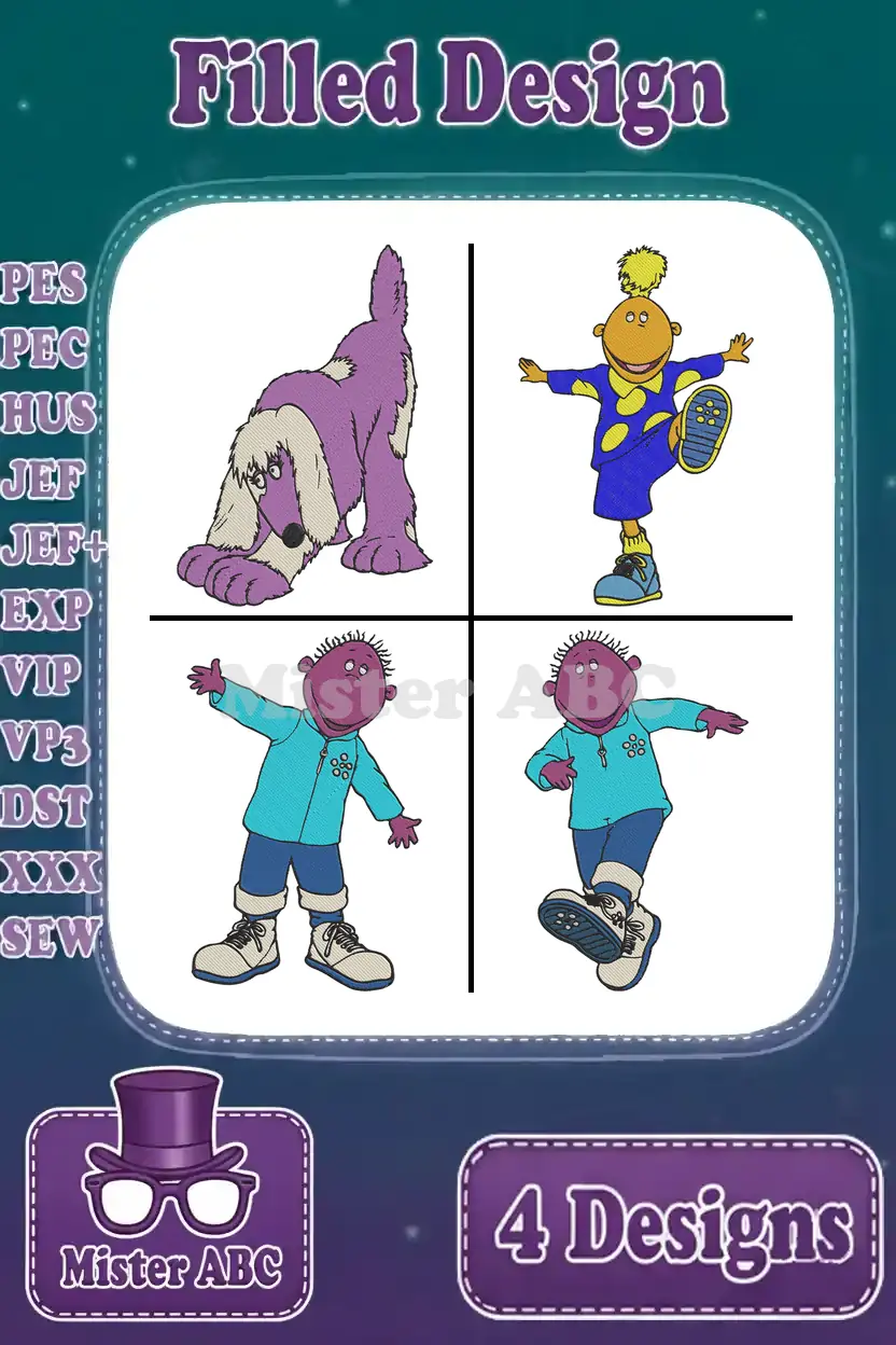 Tweenies Fizz Yellow Character Bella Blue Jake Green Milo Purple Group Fun – Filled Embroidery Design
