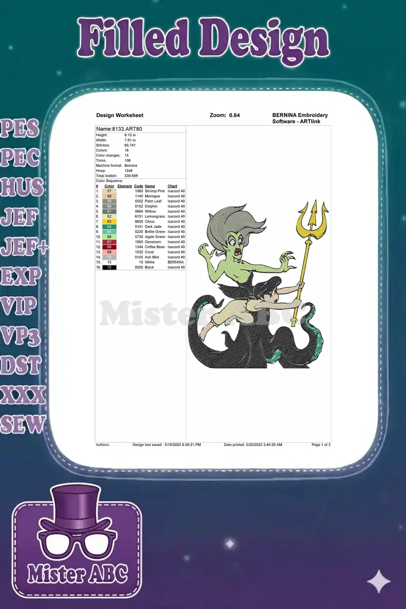 Ursula and Ariel as Vanessa trident battle embroidery designs
